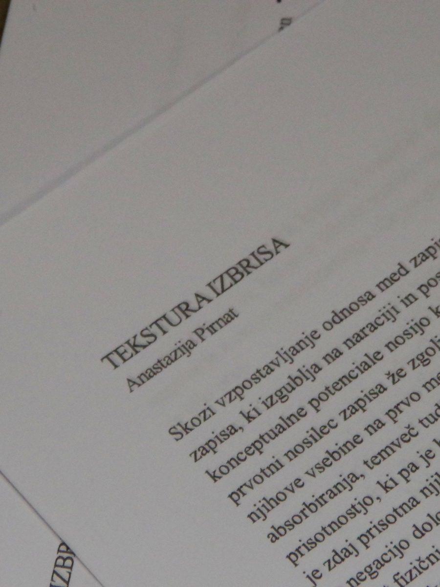 Anastazija Pirnat z razstavo Tekstura izbrisa, ki je do konca meseca na ogled v raum AU, skozi vzpostavljanje odnosa med zapisom in njemu nasprotnim izbrisom, preiskuje pomen zapisa ter konstruira nove pomene, nove slike, skulpture.