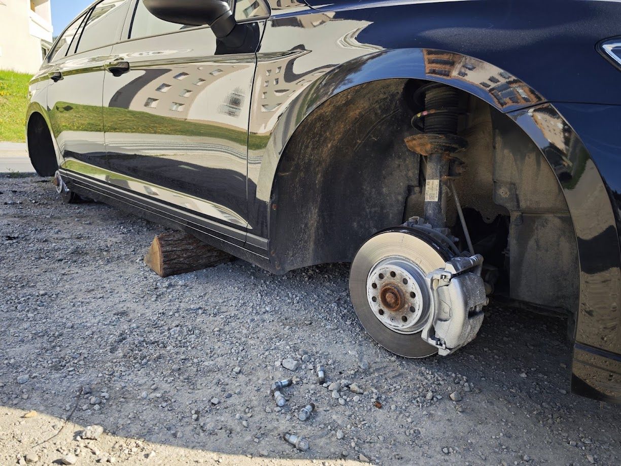 Z obeh vozil so odstranili platišča s pnevmatikami, za seboj so pustili samo vijake in materialno škodo.
