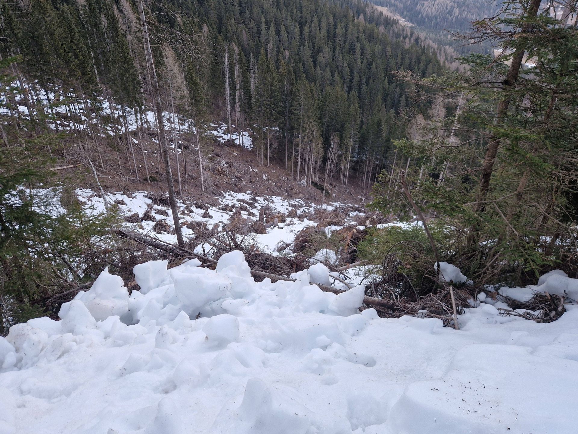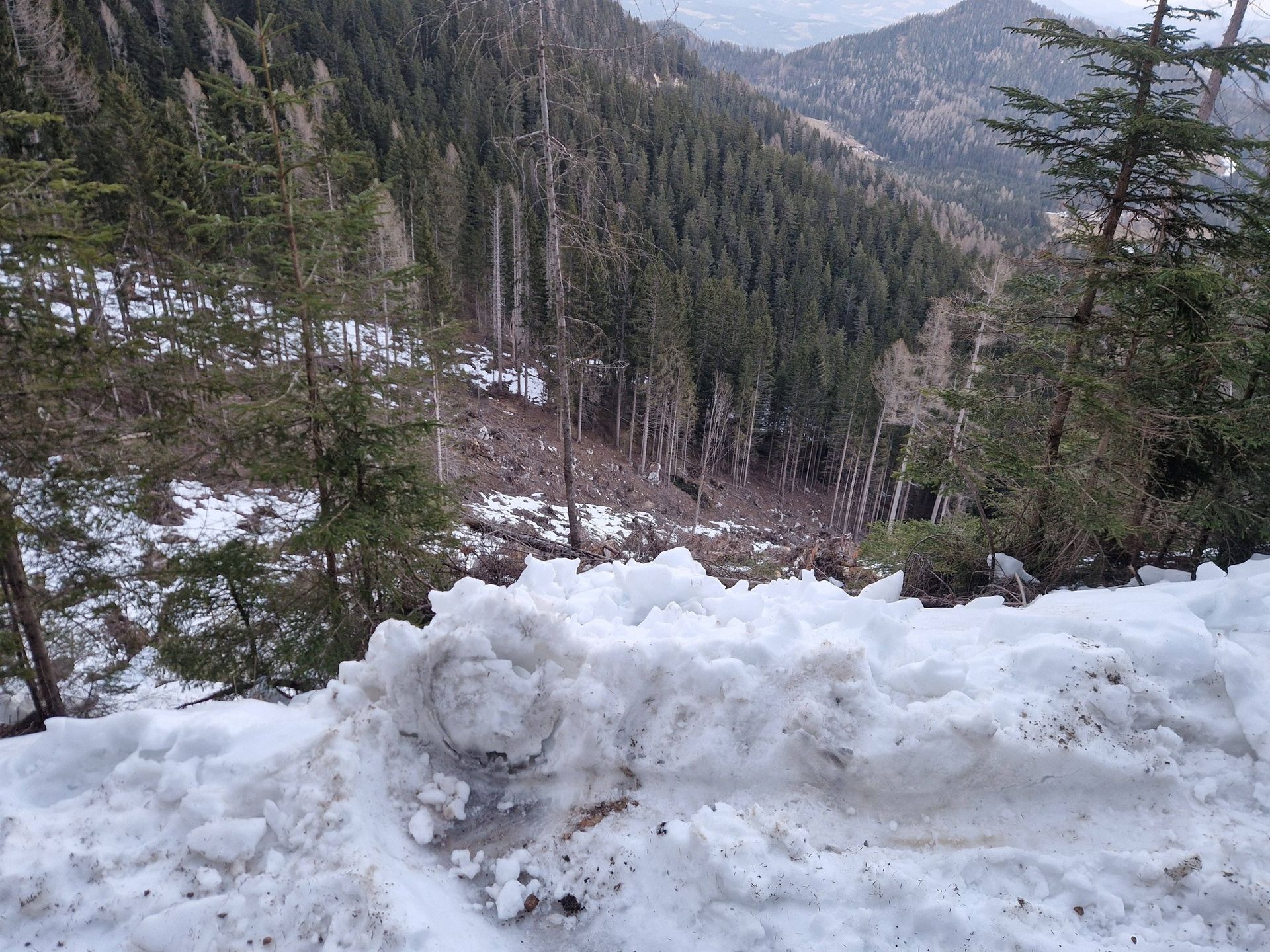 Vozilo, ki je vozilo po poledeneli cesti pod parkiriščem Jakobe pod Peco, je skoraj zapeljalo čez rob cestišča.