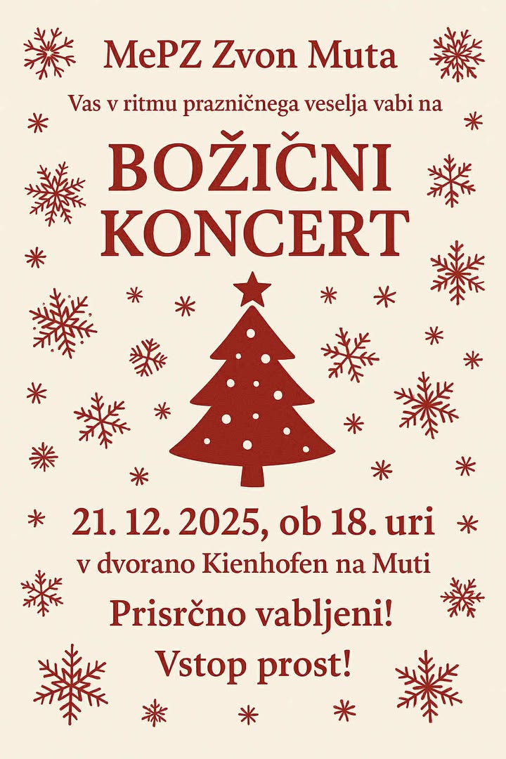 Tudi nedelja, 21. decembra, bo božično obarvana, saj bodo s svojim ubranim petjem in božičnim programom navdušili MePZ Zvon Muta. S programom, ki ga pripravljajo, bodo v dvorani Kienhofen ob 18. uri poskrbeli za večer, poln glasbe in topline v ritmu prazničnega veselja.