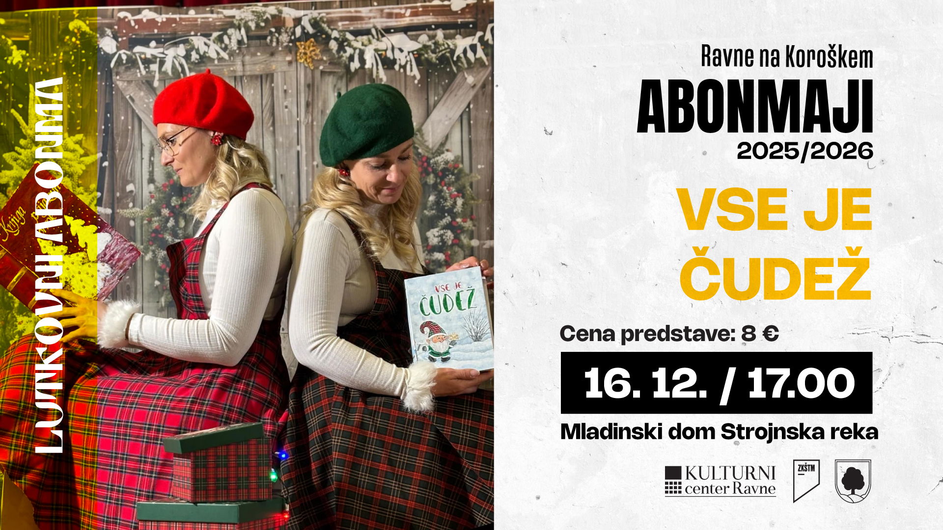 Lutkovni abonma Kulturnega centra Ravne tudi to sezono navdušuje najmlajše s čudovitimi predstavami, naslednja bo najmlaše očarala v torek, 16. decembra 2025, ob 17. uri, ko bo v Mladinskem domu v Strojnski Reki gostovala predstava Vse je čudež.