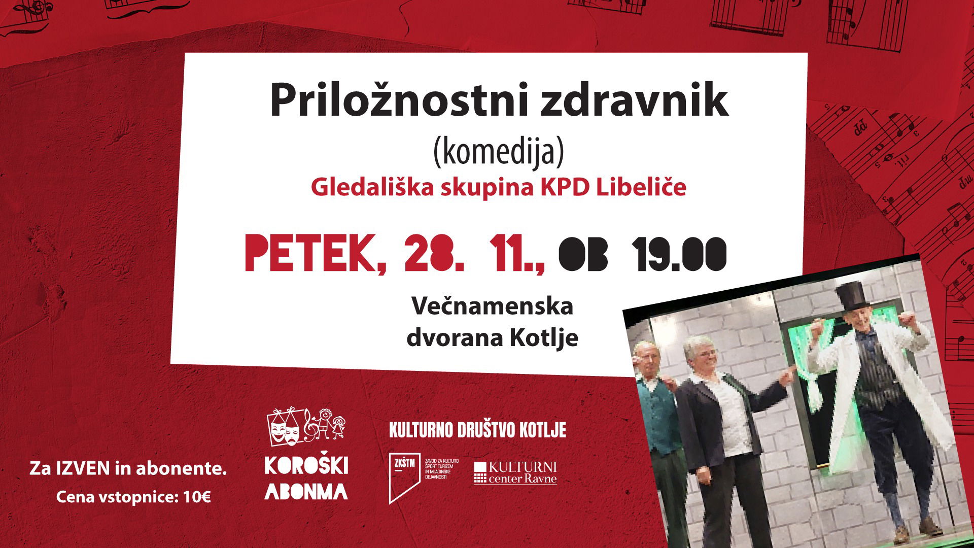 Prva od predstav domačega programa nas bo nasmejala že ta četrtek, 27. novembra 2025, ob 19. uri, ko bo v Kotljah gostovala Gledališka skupina Libeliče s komedijo Priložnostni zdravnik.