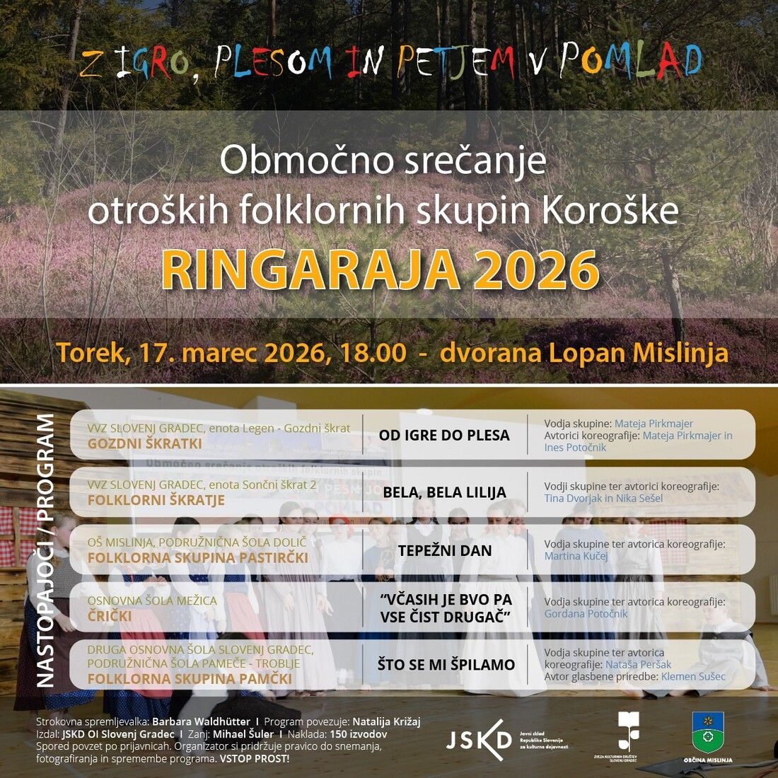 Prvo srečanje bo potekalo v torek, 17. marca 2026, ob 18.00 v veliki dvorani Lopan, kjer bodo na oder stopili otroci iz različnih folklornih skupin Koroške.