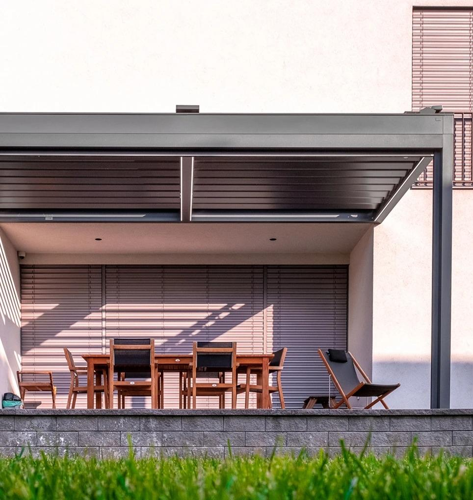Raziskave na področju trajnostne arhitekture potrjujejo, da je zunanje senčenje bistveno učinkovitejše od notranjih senčil, saj energijo sonca zaustavi zunaj toplotnega ovoja stavbe. S Hard-Top pergolo lahko z enim klikom na teraso spustite sonce ali se popolnoma zavarujete s trdno streho.