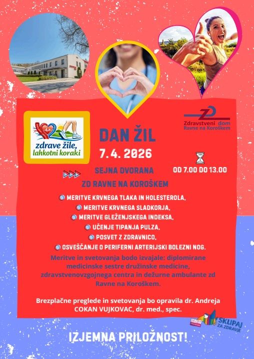 V Zdravstvenem domu Ravne na Koroškem v torek, 7. aprila 2026, pripravljajo Dan žil, namenjen osveščanju o zdravju ožilja in preventivi. Z dogodom, ki bo potekal med 7. in 13. uro, želijo doseči širši krog ljudi in jih spodbuditi k skrbi za svoje zdravje.