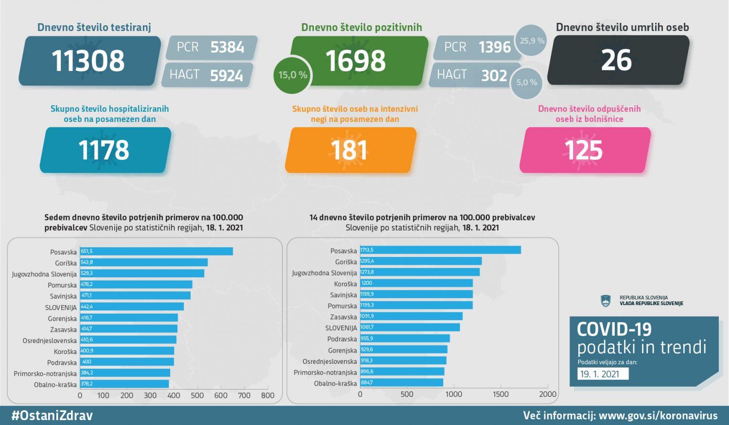 Trend obolelosti s koronavirusom v Sloveniji na dan 19. 1. 2021 (00:00-24:00):