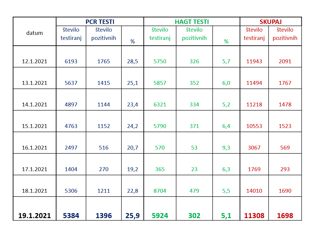 Včeraj je bilo opravljenih 5.384 PCR testiranj. Z njimi je bilo potrjenih 1.396 novih okužb (25,9 %). Včeraj je bilo opravljenih tudi 5.924 hitrih antigenskih testov. Z njimi sta bili potrjeni 302 novi okužb (5,1 %).