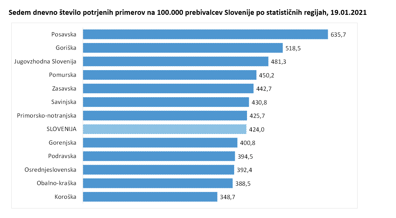 7-dnevno povprečno število potrjenih primerov v Sloveniji-dnevno po statističnih regijah, 19. 01. 2021
