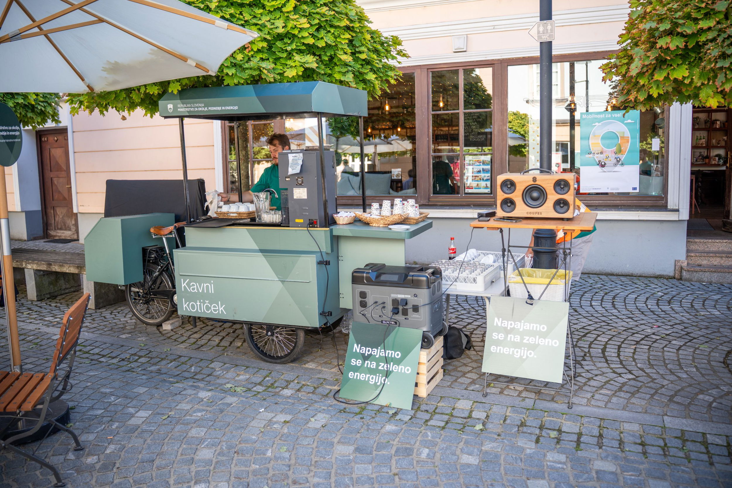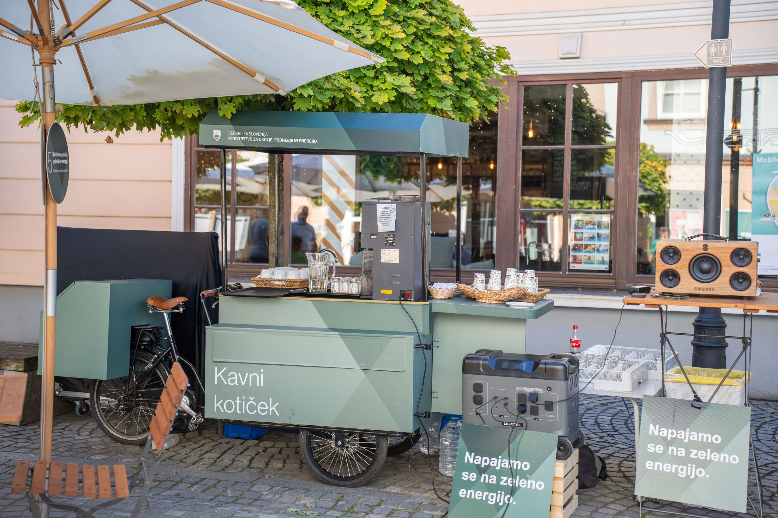 Potujoča kavarna zelene prihodnosti je bila danes postavljena v središča Slovenj Gradca, kjer so obiskovalci lahko svetovalce Ministrstva za okolje, podnebje in energijo, Eko sklada in Borzen povprašali vse, kar jih zanima glede pridobivanja sredstev za nakup e-koles in brezemisijskih vozil, električnih polnilnic, sofinanciranja lastnih sončnih elektrarn, kreditiranja svojih zelenih investicij, energetskih sanacij domov in podobno.