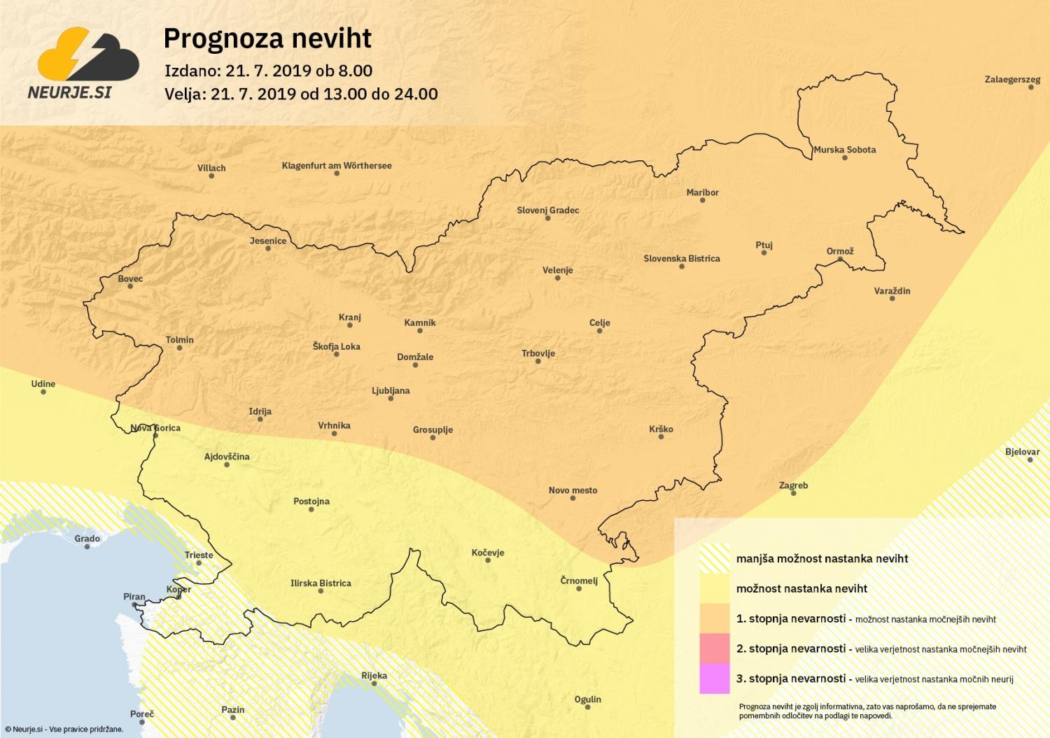 Za razvoj bo ob pregretem ozračju na voljo med 1000 in 2000 J/kg potencialne konvektivne energije. Možen je razvoj močnejših neviht. Ob nevihtah bodo popoldan ponekod v severni, vzhodni in deloma osrednji Sloveniji možni močnejši, lahko tudi dolgotrajnejši nalivi, sunki nevihtnega piša, ki lahko doseže hitrost okoli 80 km/h in toča, ki lahko ob nastanku močnejše nevihtne celice v premeru doseže 4 cm. V noči na ponedeljek se bo ozračje umirilo, napovedujejo na spletni strani Neurje.si.