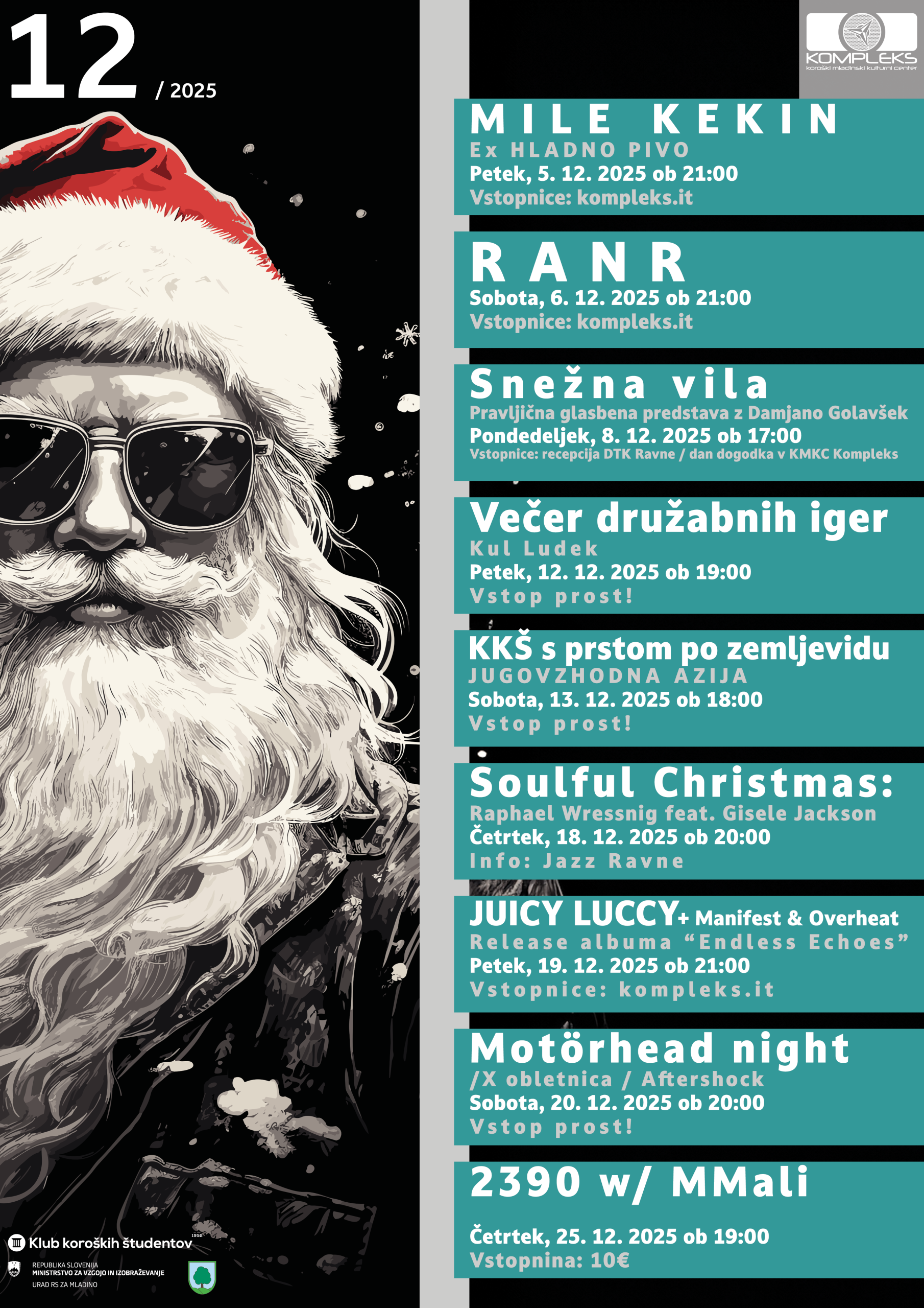 S prvim začnejo že v petek, 5. decembra 2025, ko bo najlepšo klet na Koroškem obiskal Mile Kekin, ki je vedno za ”za mrzo pir”, če sklepamo po dolgoletnem sodelovanju v skupini Hladno pivo. Občinstvo čaka večer brezčasnih hitov, kot so Pjevajte nešto ljubavno, Superman, Pitala si me, Nije sve tako sivo, Samo za taj osjećaj ter številne druge, poleg osebnih zgodb in družbeno angažirane glasbe Kekinovega solo projekta.