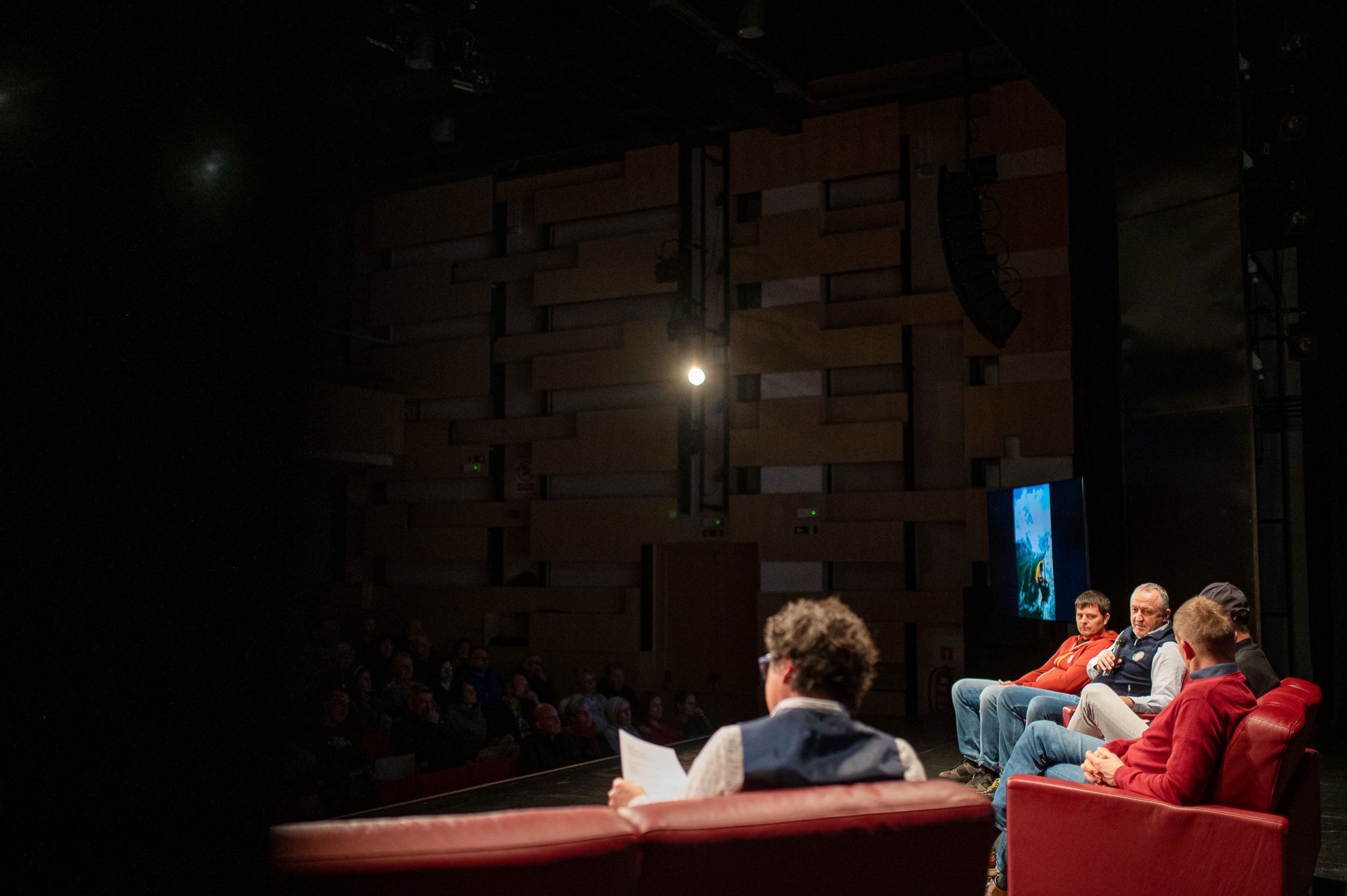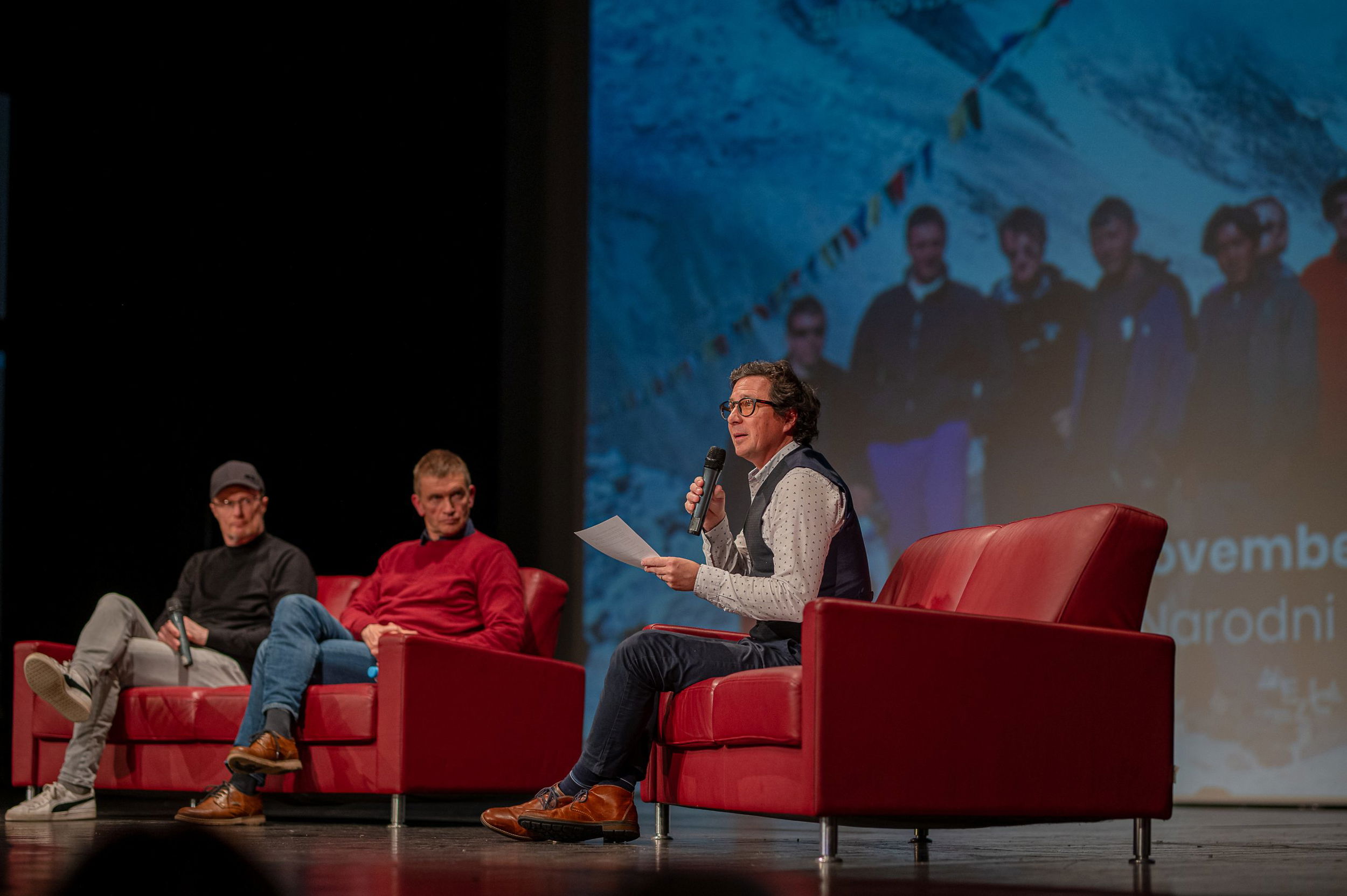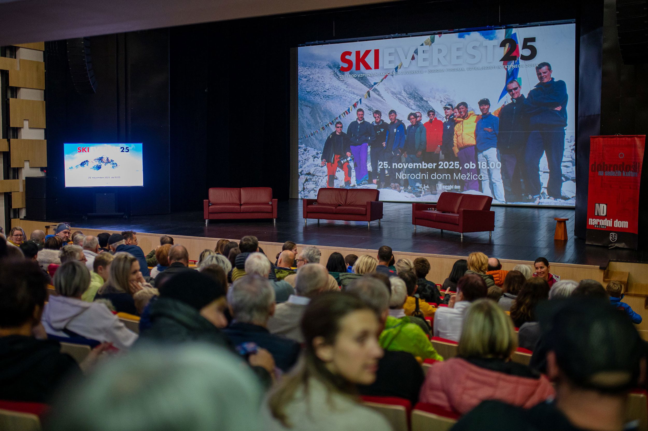 V nabito polni Veliki dvorani Narodnega doma Mežica so v pogovoru, ki ga je vodil Peter Mikša, spomine na to izjemno odpravo obujali Matej Flis, Tadej Golob, dr. Jurij Gorjanc in Drejc Karničar, brat pokojnega Dava Karničarja.