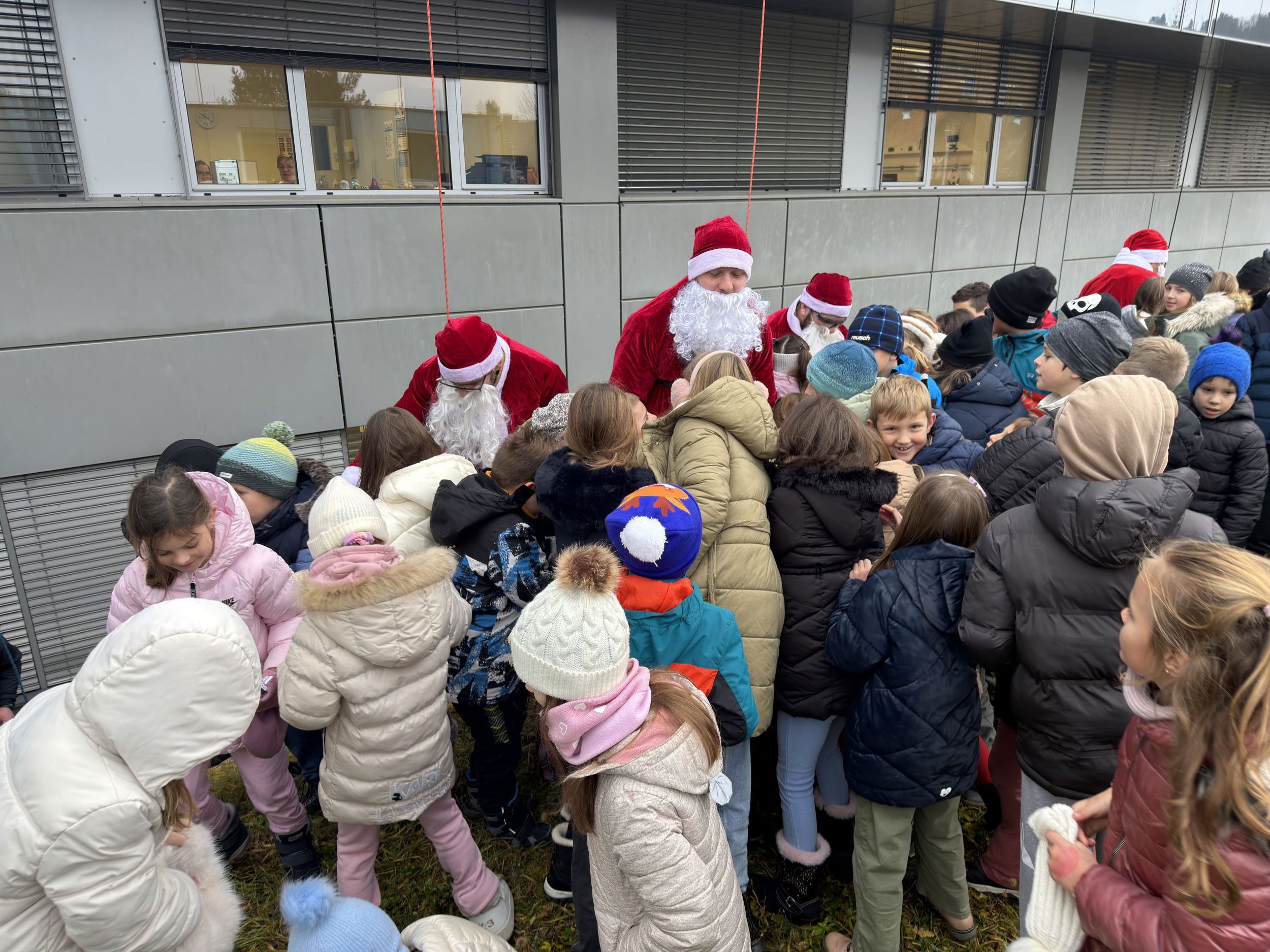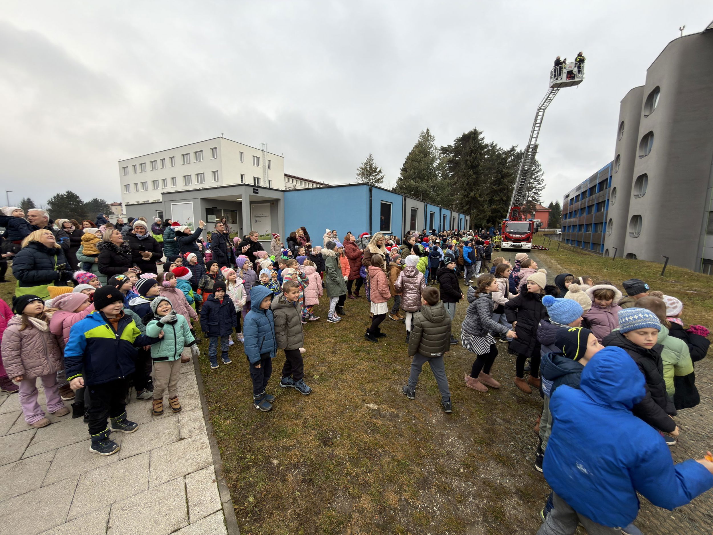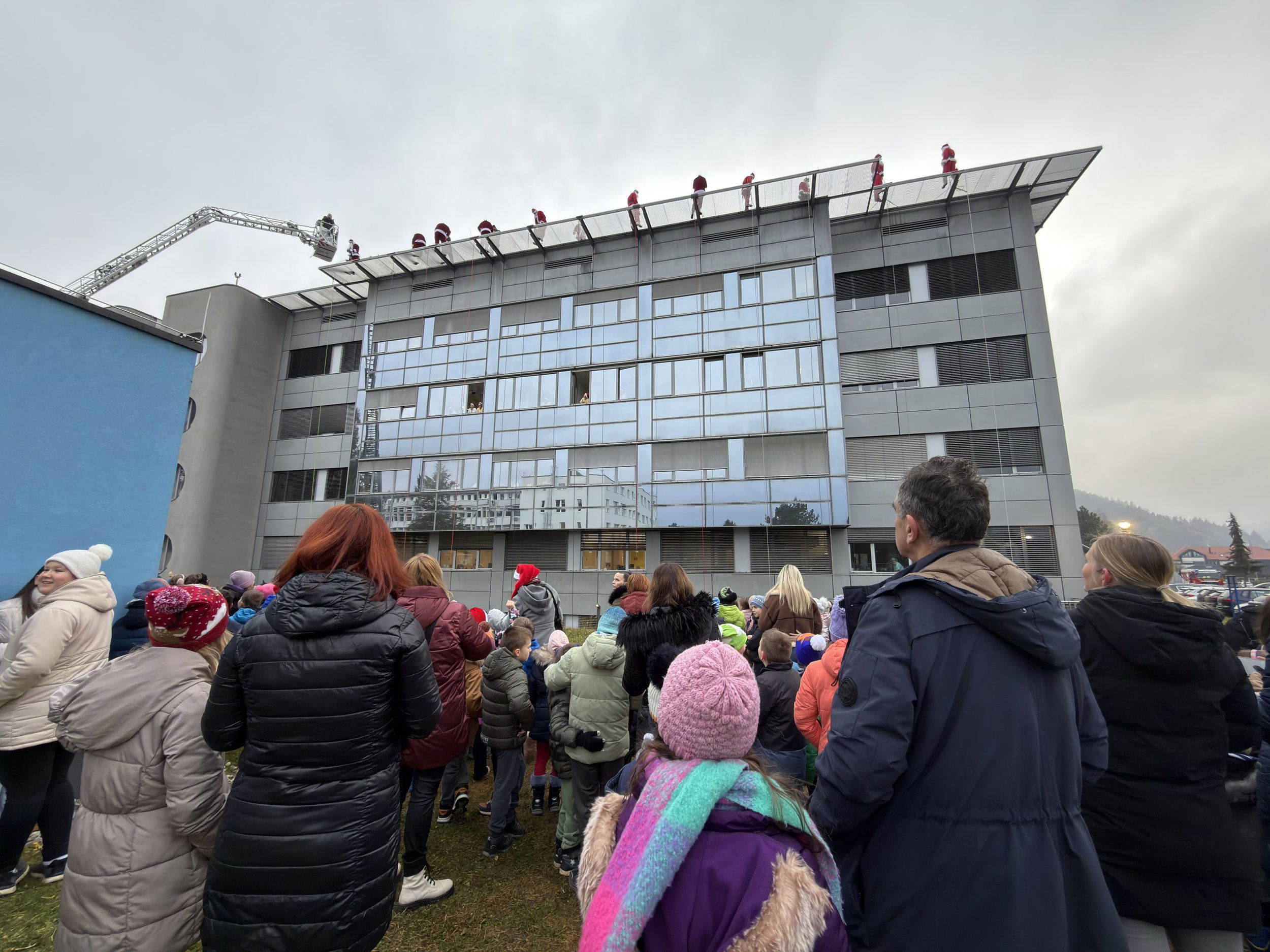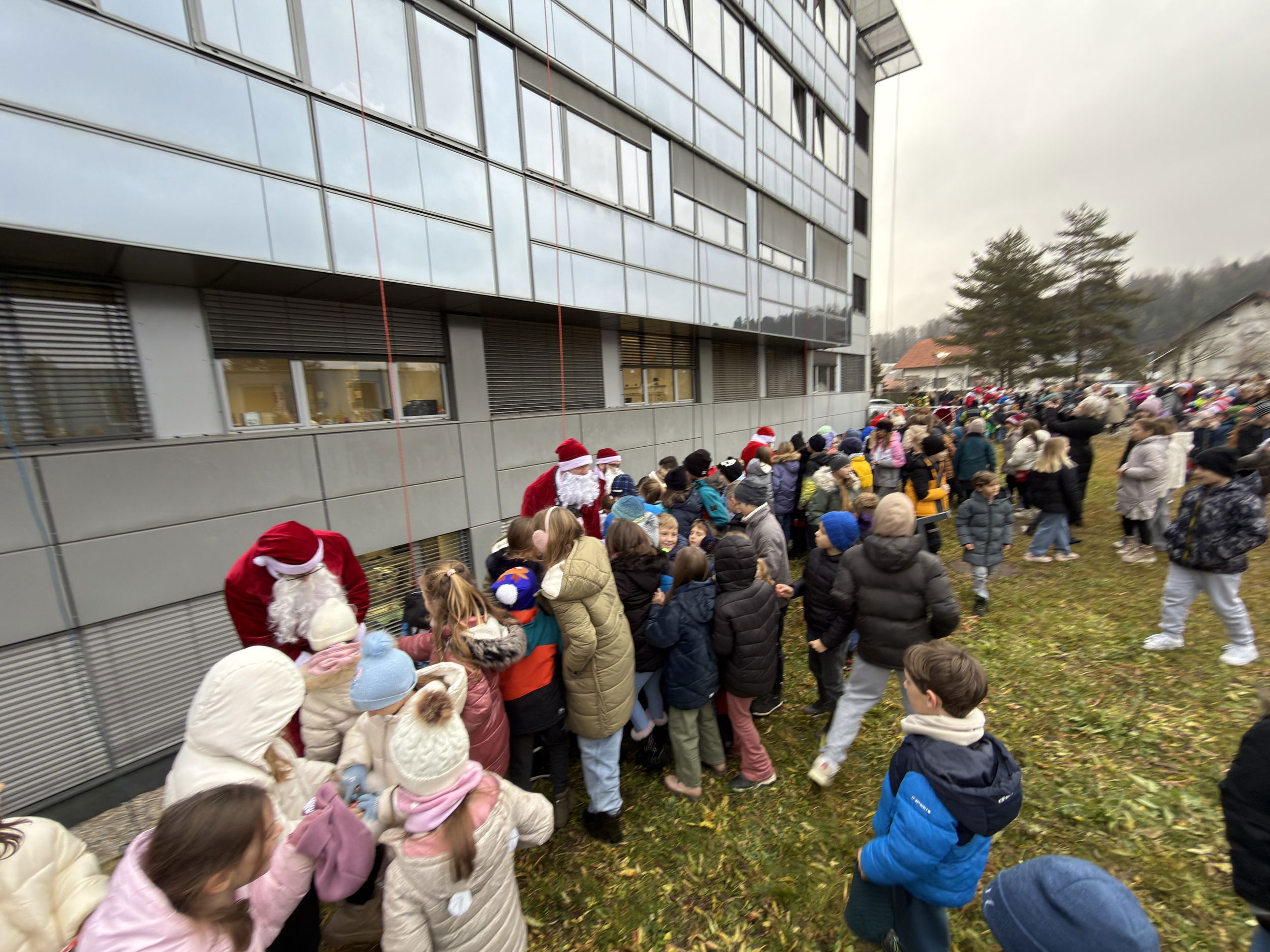 Pred bolnišnico se je zbralo lepo število gledalcev, ki so z navdušenjem opazovali pogumne Božičke pri njihovem veličastnem prihodu. Ti so med otroke razdelili bonbone in tople besede.
