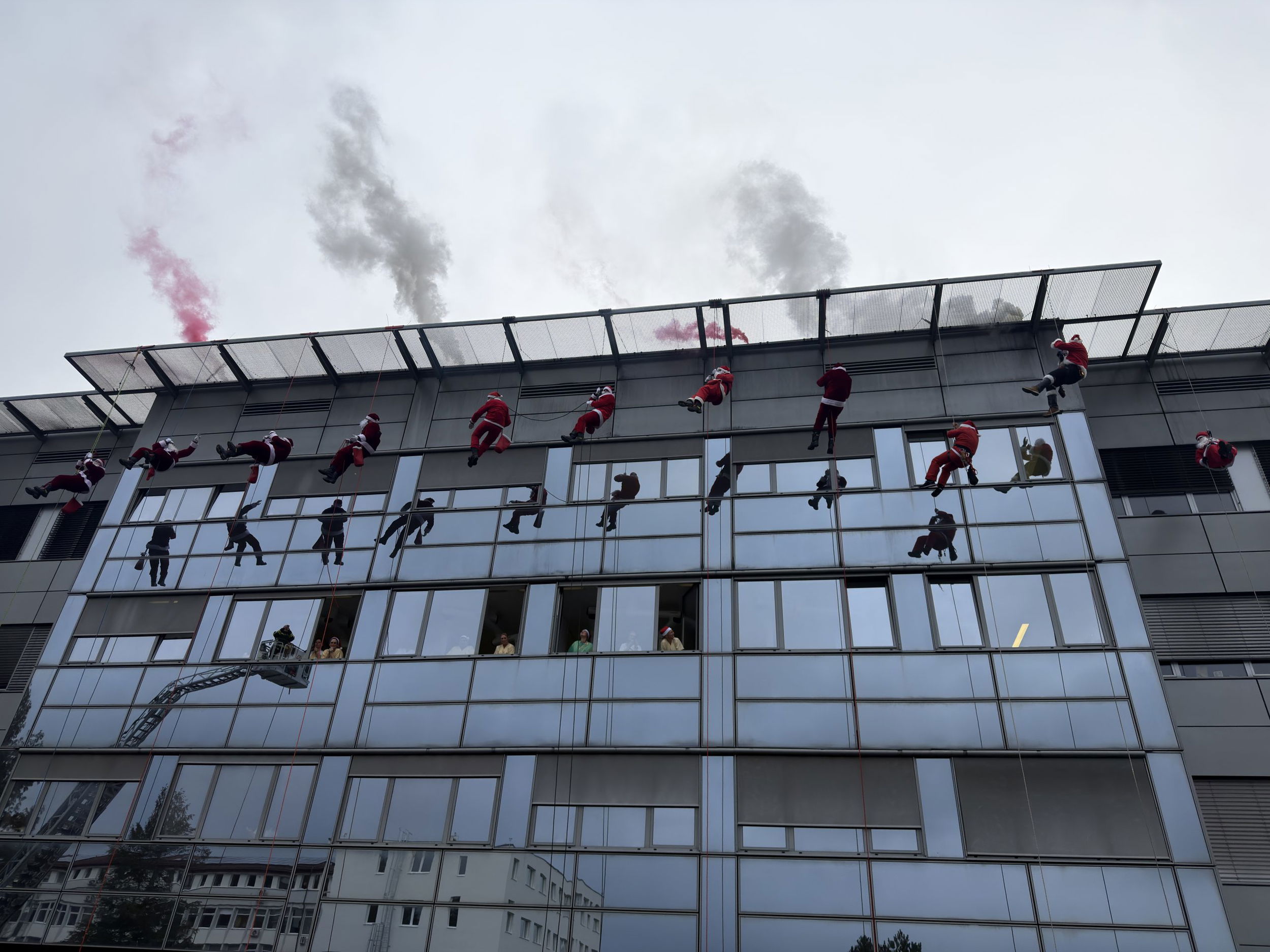 Ob 10.30 uri se iz heliporta bolnišnice spustilo kar dvanajst Božičkov, članov PGD Slovenj Gradec, in na obraze najmlajših, njihovih staršev, zaposlenih in drugih obiskovalcev pričaralo nepozabne nasmehe.