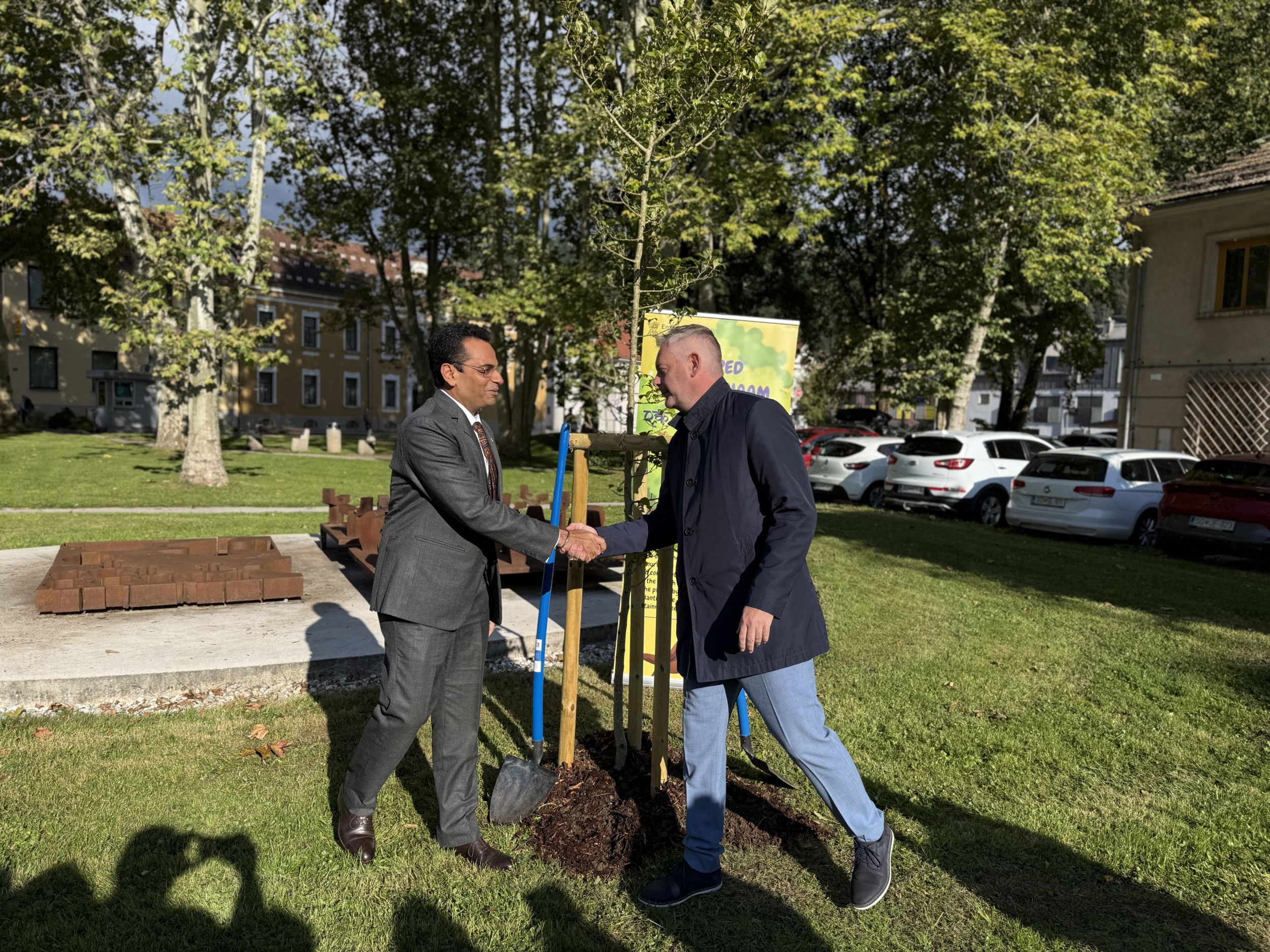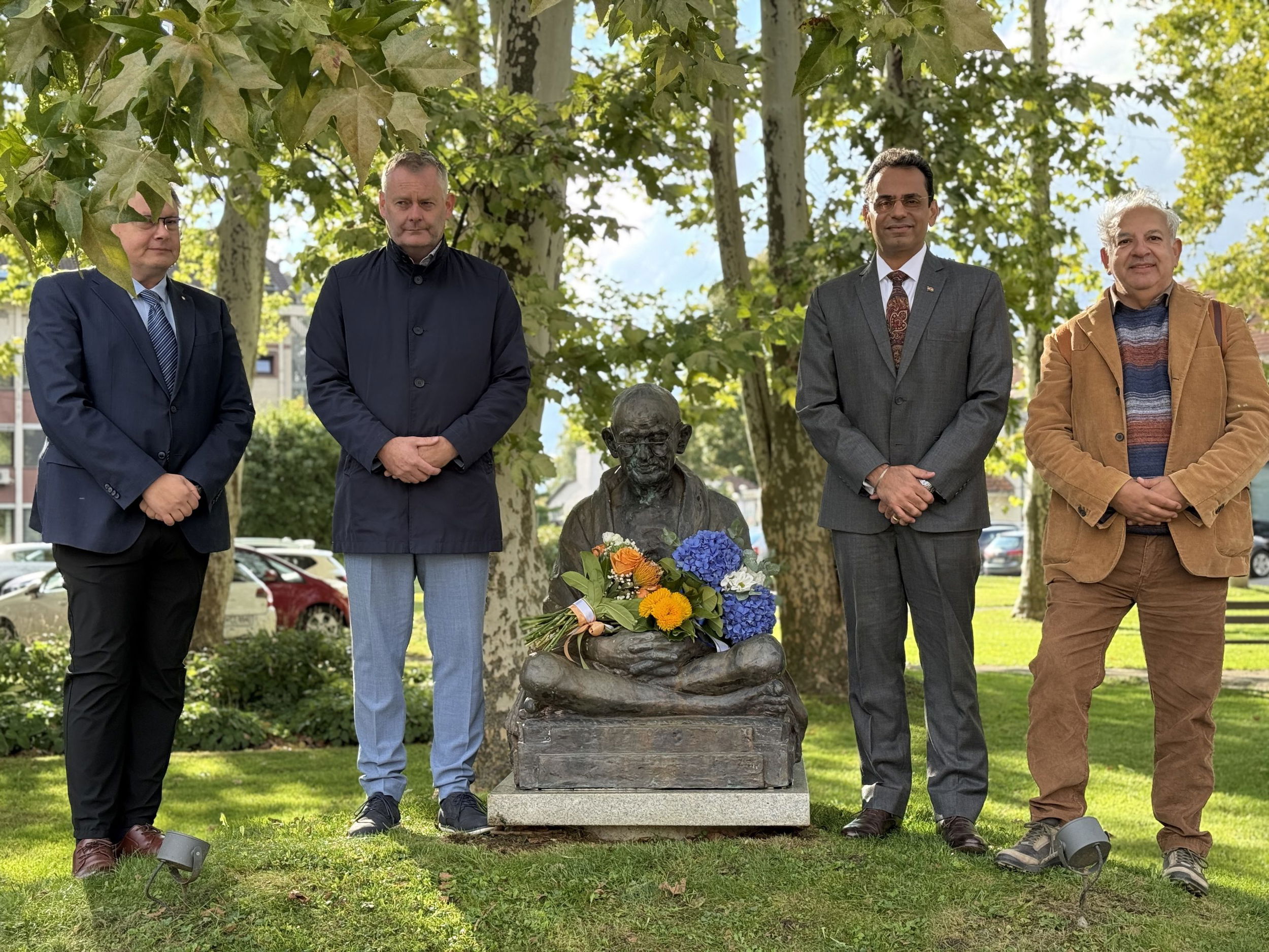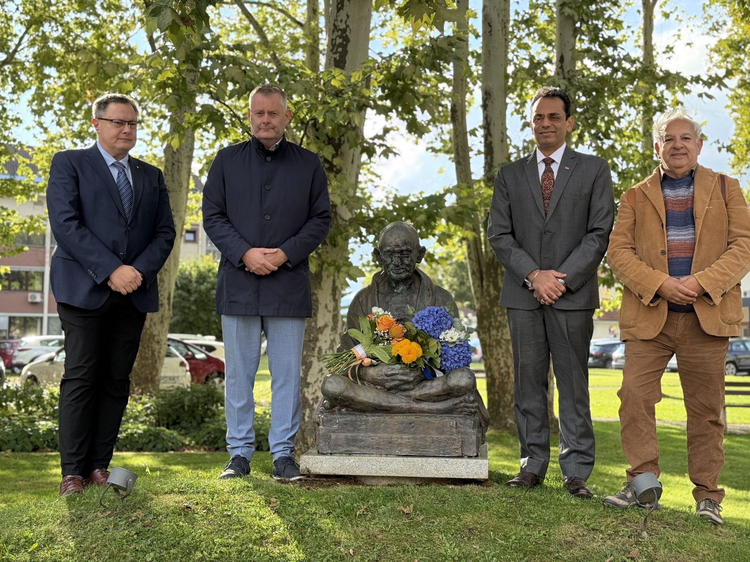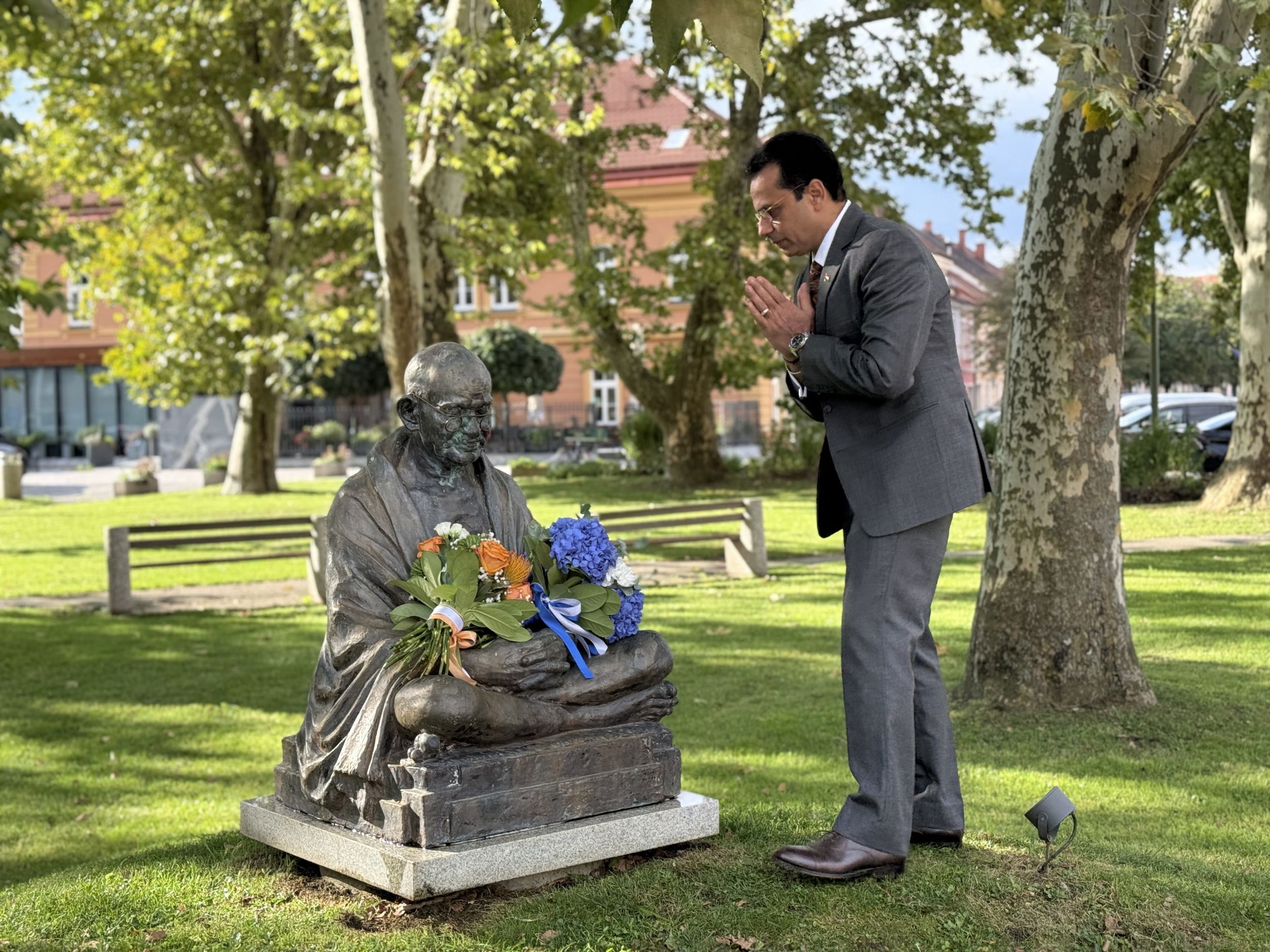 Obisk so pričeli ob 9.30 v parku pri Gandijevem spomeniku, kjer je veleposlanik položil cvetje, v znak prijateljskih vezi med državama je nato skupaj z županom Tilnom Kluglerjem zasadil tudi drevo, ki bo simbolično povezovalo Slovenijo in Indijo. Izrazil je veselje, da lahko skupaj obeležijo rojstni dan Mahatme Gandija, ki se obeležuje tudi kot mednarodni dan nenasilja. “Mahatma Gandhi ima posebno povezavo s Slovenj Gradcem, je neke vrste ‘občan’ mesta, saj je tukaj že več let in združuje Indijo ter Slovenijo s prijateljsko vezjo in skupnimi vrednotami,” je veleposlanik poudaril v nagovoru. Da bo zasajeno drevo nov simbol mesta miru in prijateljskega odnosa med dvema državama, je še izpostavil.