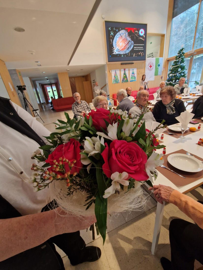 Rdeči križ je tudi letos pripravili majhno pozornost za najstarejša udeleženca srečanja – gospo Homan in gospoda Čekona. Darilo so jima skupaj predali podžupan Andrej Erjavec, Magdalena Piko in Franja Mlakar.