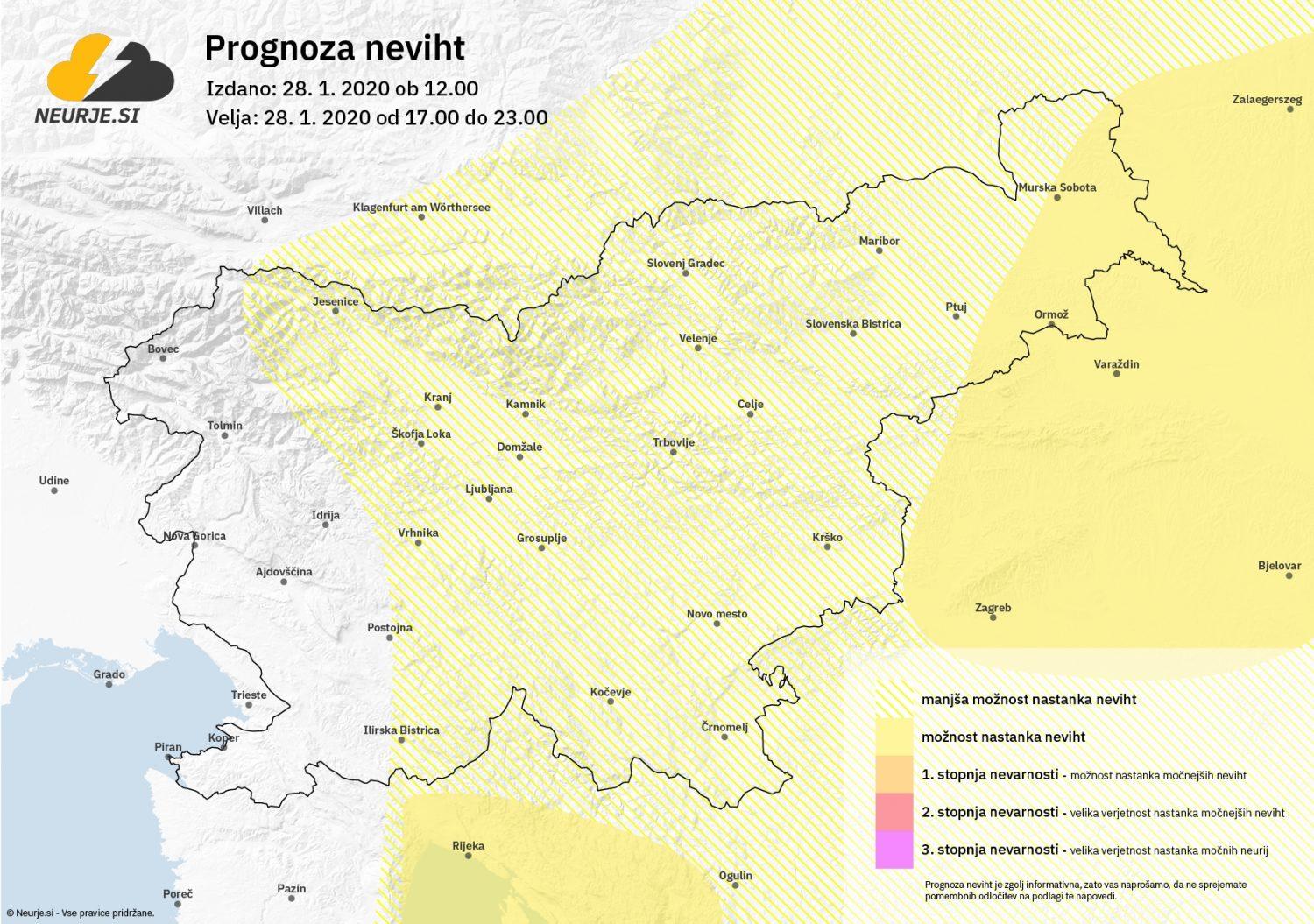 Ob prihodu hladne fronte bo zapihal veter severnih smeri, ki lahko ponekod v severovzhodni Sloveniji, v sunkih doseže hitrost okoli 70 km/h. Lahko tudi zagrmi. V Prekmurju in Podravju so prehodno možni nalivi, lokalno lahko tudi sodra. Temperatura bo hitro padla, posledično pa ob koncu padavin tudi meja sneženja. Ta se lahko ponekod na Koroškem in Štajerskem ob koncu padavin spusti tudi do nižin, a omembe vredne snežne odeje po nižinah ni pričakovati. V višje ležečih krajih, predvsem na Koroškem bo ponekod zapadlo do 10 cm snega.