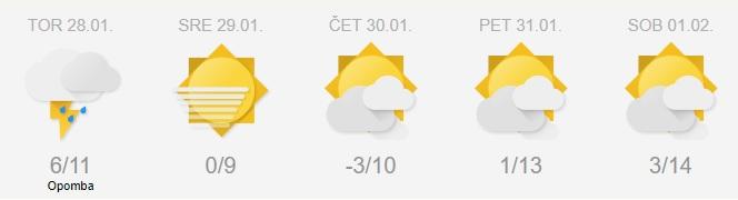 Čez dan in popoldne bo spremenljivo oblačno. Na vzhodu Slovenije bo občasno tudi delno jasno, a se bo popoldan oblačnost tudi tam postopno zgostila. V zahodni in deloma osrednji Sloveniji bo občasno deževalo ali rosilo. Marsikje bo pihal jugozahodnik. Ta bo v višje ležečih krajih na jugu Slovenije in na Pohorju, v sunkih dosegel hitrosti med 50 in 80 km/h. Najvišje dnevne temperature bodo v vzhodni Sloveniji in ob morju med 10 in 14 °C, drugod večinoma med 7 in 11 °C.