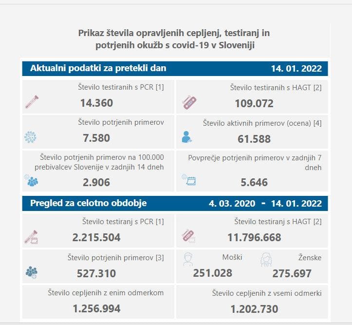 V petek so v Sloveniji ob opravljenih 14.360 PCR-testih potrdili 7580 okužb z novim koronavirusom, dan pred tem so ob opravljenih 13.681 PCR-testih potrdili 6918 okužb. Delež pozitivnih PCR-testov je znašal 52,8 odstotka, dan pred tem je bil 50,6–odstoten. Opravili so tudi hitrih testov, katerih pozitivne rezultate preverjajo še s PCR-testi, dan pred tem 109.072.