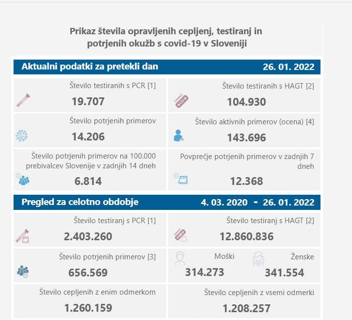 V sredo so v Sloveniji ob opravljenih 19.707 PCR-testih potrdili 14.206 okužb z novim koronavirusom, dan pred tem so ob opravljenih 22.924 PCR-testih potrdili 17.491 okužb. Delež pozitivnih PCR-testov je znašal 72,1 odstotka, dan pred tem je bil 76,3–odstoten. Včeraj so opravili tudi 104.930 hitrih testov, katerih pozitivne rezultate preverjajo še s PCR-testi, dan pred tem 92.965.