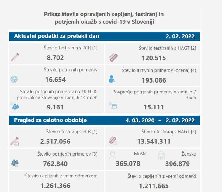 V sredo so v Sloveniji opravili 8702 PCR-testa in 120.515 hitrih antigenskih testov ter potrdili 16.654 novih okužb. Dan pred tem so opravili 17.143 PCR-testov in 96.160 hitrih antigenskih testov. Potrdili pa so 23.433 novih okužb. Pred tednom dni so ob 19.707 PCR-testih potrdili 14.206 okužb z novim koronavirusom. Opravili pa tudi 104.930 hitrih testov, katerih pozitivne rezultate so preverjali še s PCR-testi.
