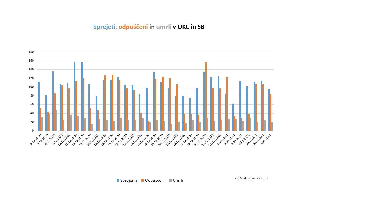 "V UKC Ljubljana so imeli danes zjutraj 318 hospitaliziranih Covidnih pacientov, od tega 51 na intenzivni terapiji. Tudi včeraj smo žal imeli smrti. Včeraj je v bolnišnicah umrlo 19 oseb, v domovih za starejše še 4, skupaj torej 23 smrti. Svojcem in bližnjim umrlih izrekam iskreno sožalje," je dodal vladni govorec.