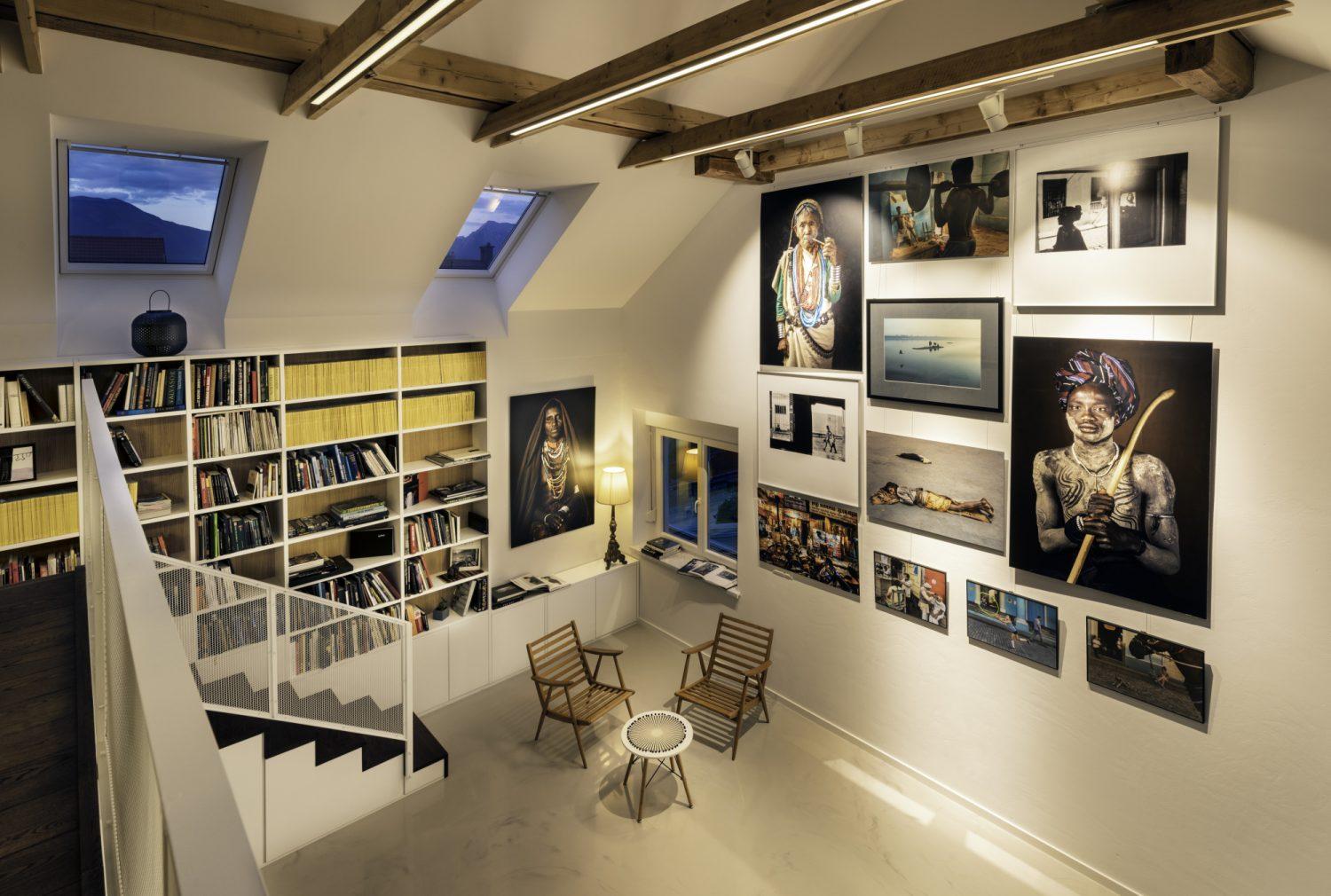 Bivalni prostor je pravzaprav dodatek h studiu, pravita fotografa, ki večino časa, ko ne hodita po svetu, dejansko preživita v ateljeju. Kljub temu sta seveda tudi v nadstropju ustvarila prostor, poln domačnosti, toplih in naravnih tonov, z veliko naravne svetlobe. V dekorativnem smislu postavlja ta del v ospredje najlepše, kar je nudilo staro podstrešje – vidne tramove ostrešja. Stanovanjska enota se namreč nahaja pod obstoječo dvokapno streho, zato so tramovi izjemno privlačen naravni detajl vseh zgornjih prostorov.