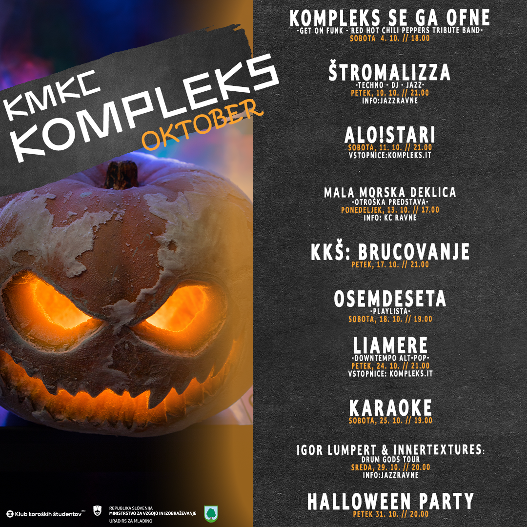 Oktober je mesec, ko se v KMKC Kompleks vrnemo spočiti, polni energije in pripravljeni na najboljše žure. Čaka nas oktobrski program, ki nikogar ne bo pustil ravnodušnega. Za vsak okus se nekaj najde, zato se odpravite v najlepšo klet na Koroškem, kjer vas čakajo nepozabni trenutki v najboljši družbi.