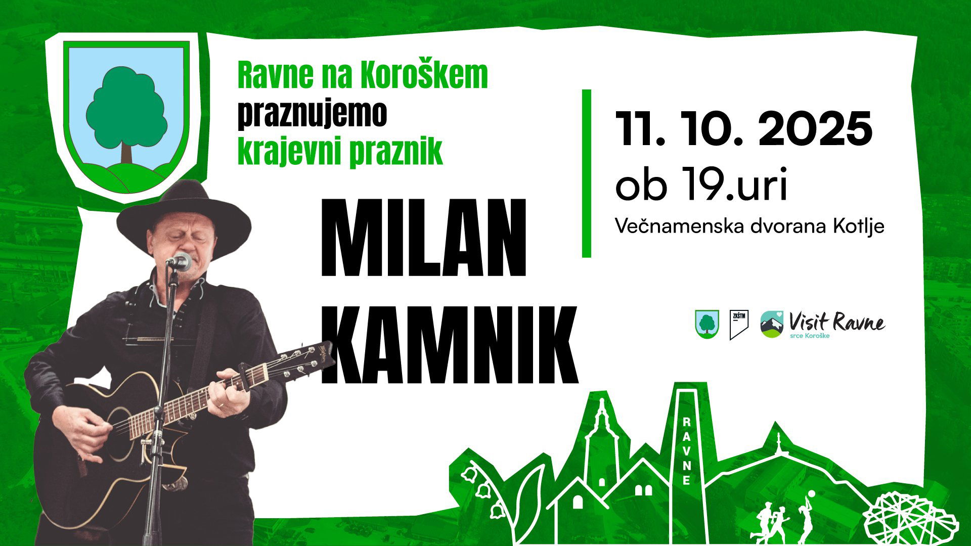 V sklopu Praznika mesta Ravne se v Kotljah obeta čaroben večer, saj bo na oder Večnamenske dvorane Kotlje v soboto, 11. oktobra 2025, ob 19. uri, stopil en in edini Milan Kamnik, legenda koroškega coutryja.