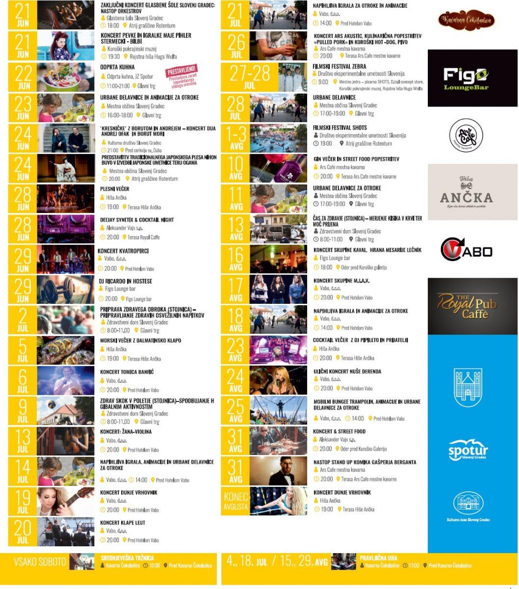 V okviru Slovenjgraškega poletja, ki ga organizira Kulturni dom Slovenj Gradec so vam pripravili tudi druge poletne prireditve, ki se bodo odvijale v mestnem jedru Slovenj Gradca vse do konca avgusta. Letos so se organizatorji Javni zavod Spotur in Mestna občina Slovenj Gradec povezali z gostinskimi lokali v mestu in tako se bo vsebinsko zelo raznolik program odvijal tudi na njihovih terasah, oziroma na različnih lokacijah v mestu.