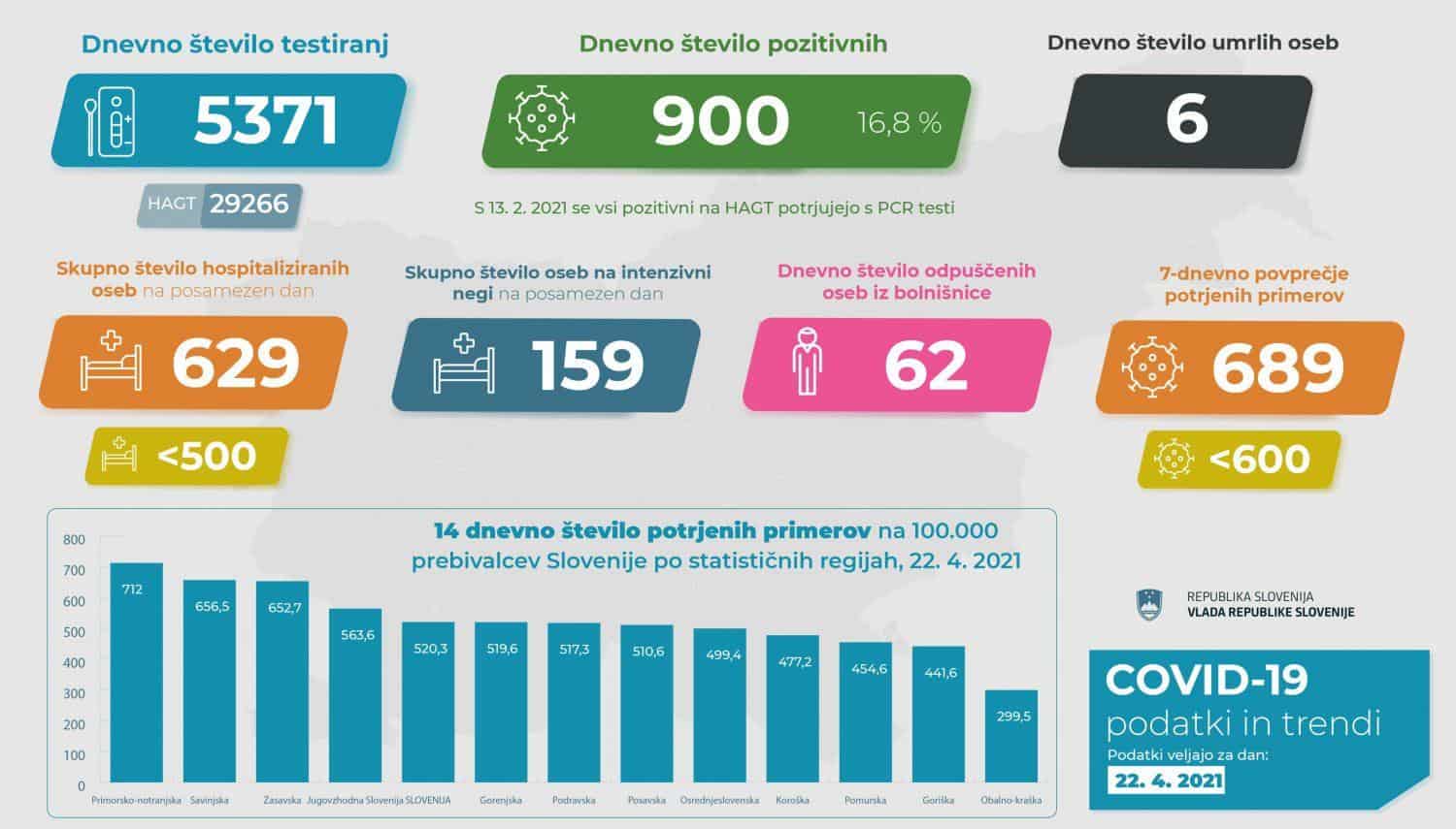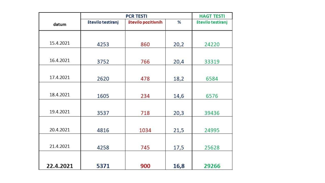 Včeraj je bilo ob opravljenih 5.371 PCR testiranjih potrjenih 900 novih okužb. Opravljenih je bilo tudi 29.266 HAGT testov. Število okužb je bilo včeraj v primerjavi z enakim dnem prejšnji teden nekoliko višje, je dejala Maja Bratuša. 7-dnevno povprečje okužb danes znaša 689, včeraj 684.