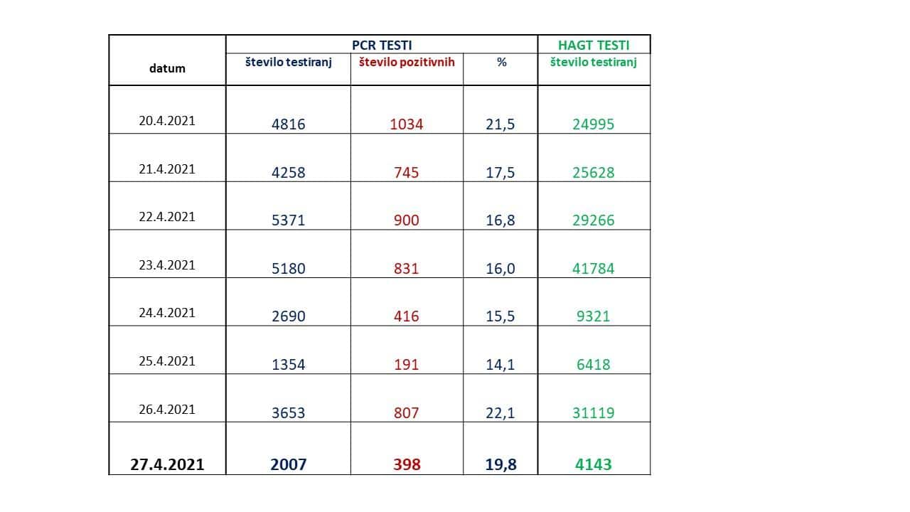 Maja Bratuša je uvodoma dejala, da so zaradi prazničnega torka danes številke opravljenih testov nižje kot običajno. In sicer je bilo včeraj opravljenih 2.007 PCR testiranj in 4.143 hitrih antigenskih testov. S PCR testi je bilo včeraj potrjenih 398 novih okužb.