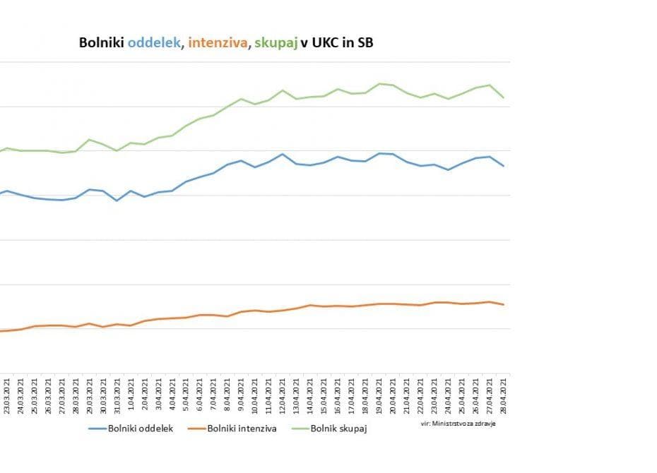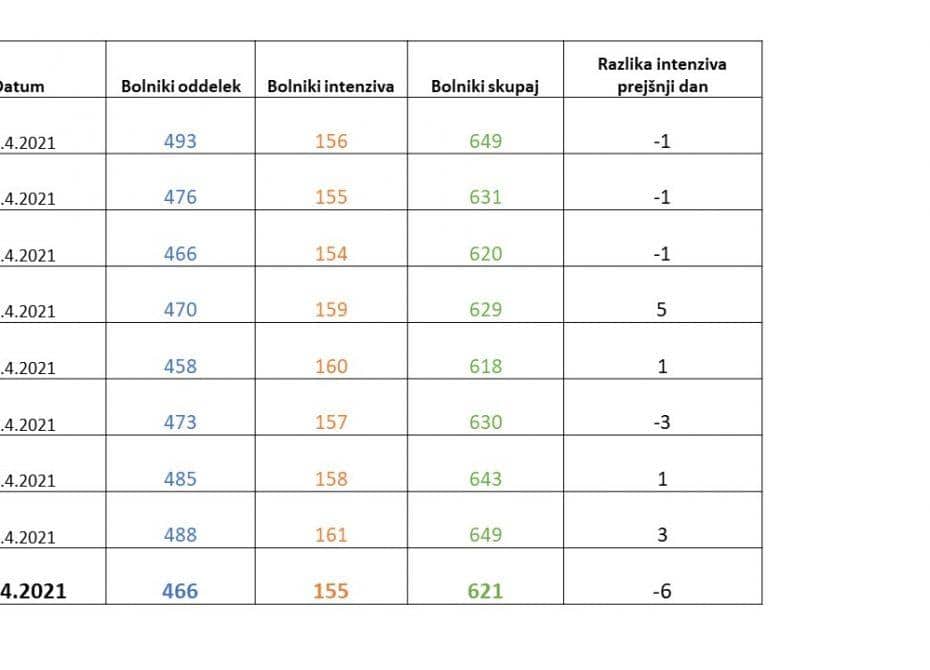 Število pacientov v bolnišnicah še vedno ostaja visoko. Skupaj se danes v naših bolnišnicah zdravi 621 covidnih pacientov, včeraj 649. Tudi postelje na intenzivni terapiji ostajajo bolj zasedene kot bi si želeli, je dejala vladna govorka. Intenzivno terapijo skupaj potrebuje 155 covidnih pacientov. Včeraj je bilo v bolnišnice skupaj sprejetih 26 pacientov, dan pred tem pa kar 71, kar kaže na to, da se razmere v bolnišnicah še ne izboljšujejo. Iz bolnišnic je bilo včeraj odpuščenih 40 pacientov, dan pred tem pa 58. Včeraj umrlo 15 oseb, 14 v bolnišnica in 1 v DSO.
