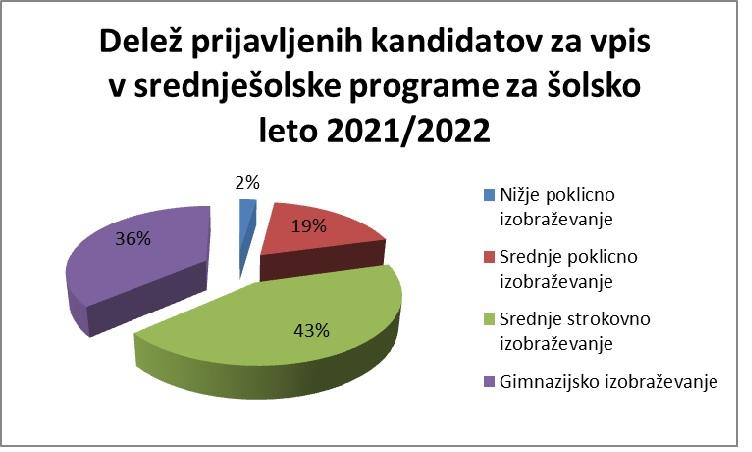 Na nižje poklicno izobraževanje se je prijavilo 470 kandidatov, na srednje poklicno izobraževanje 3703 kandidatov, v gimnazijske programe 7274. Od tega se jih je 5886 prijavilo v programe splošne gimnazije in 1388 za strokovne gimnazije. Največ, 43 odstotkov, pa se jih je prijavilo na srednje strokovno izobraževanje, to je 8614 kandidatov.