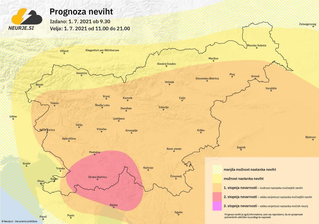 Predvsem na jugu Primorske in Notranjske lahko nastane kakšno močnejšo neurje z debelejšo točo, silovitejšimi sunki vetra in močnimi nalivi.