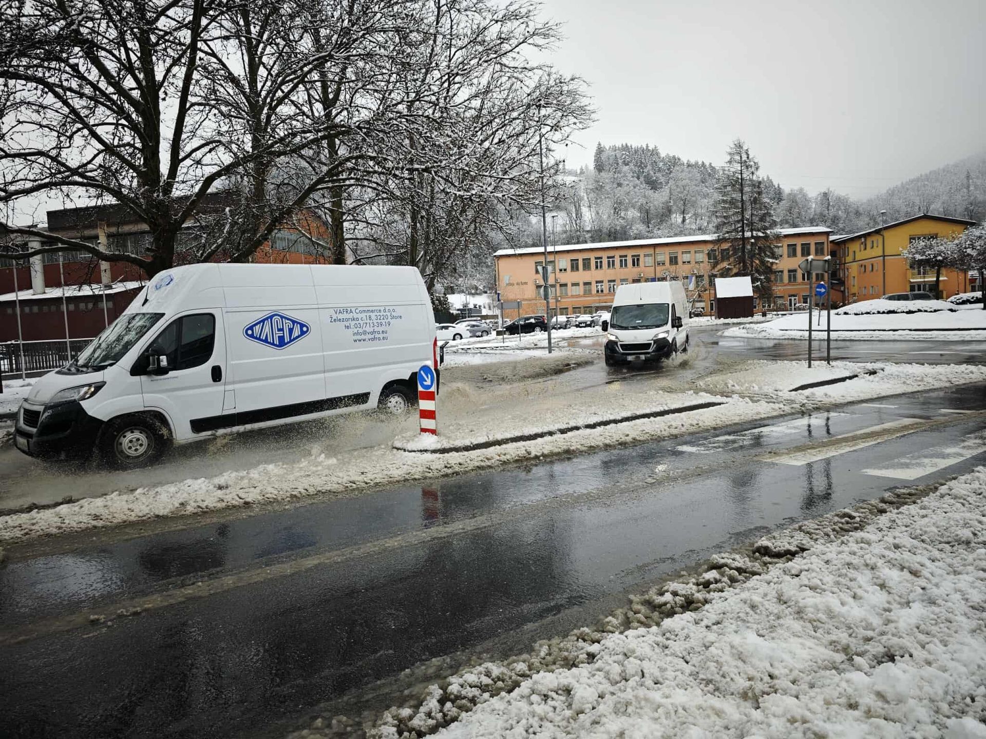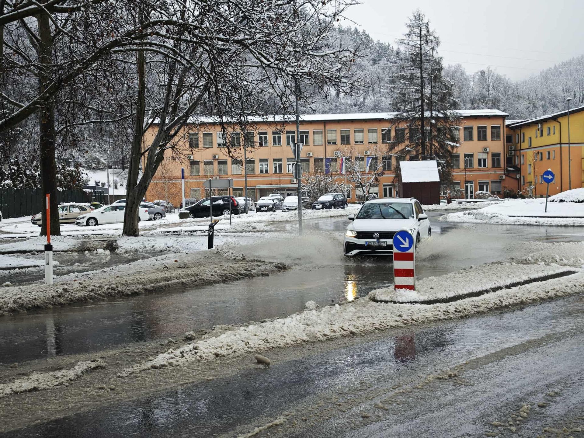 Kot poročajo, se je zaradi topljenja snega nabrala velika količina vode v krožišču, kar onemogoča normalno vožnjo. Prav tako opozarjajo na podrta drevesa, ki jih s hitrim posredovanjem odstranjujejo pripadniki gasilskih enot.