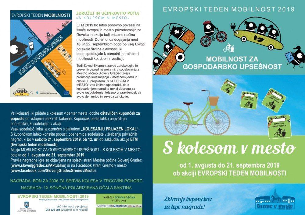 Projekt S kolesom v mesto se v okviru aktivnosti Evropskega tedna mobilnosti, v najbolj razširjeni kampanji za spodbujanje trajnostne mobilnosti, v Slovenj Gradcu izvaja že četrto leto zapovrstjo. Tokratni slogan je “Mobilnost za gospodarsko uspešnost”, ki poudarja, da lahko s kolesarjenjem brez večjih finančnih obremenitev ali posegov v infrastrukturo, poskrbimo za čistejše okolje, bolj kakovostno rabo javnega prostora in lastno zdravje. Hkrati pa lastnikom lokalov prispevamo spodbudno okolje za poslovanje in interakcijo z občani.