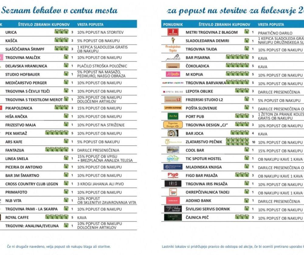 Vsi kolesarji, ki boste do 21. septembra prišli v center Slovenj Gradca, boste pri vstopnih parkirnih kabinah prejeli oštevilčen kuponček za popuste, ki so vnovčljivi v vseh lokalih, označeni z napisom “Kolesarju prijazen lokal”, je nam povedal vodja projekta Vladimir Jarh Nikolič, ki je še pojansil, da bodo s številnimi dejavnostmi tudi letos pokazali kako uresničujejo že leta 2016 zastavljene “zelene” cilje in da projekt poleg vseh popustov in potencialnih nagrad prinaša tudi spodbudo okolju, zdravju, gospodarstvu ter medčloveškim odnosom.