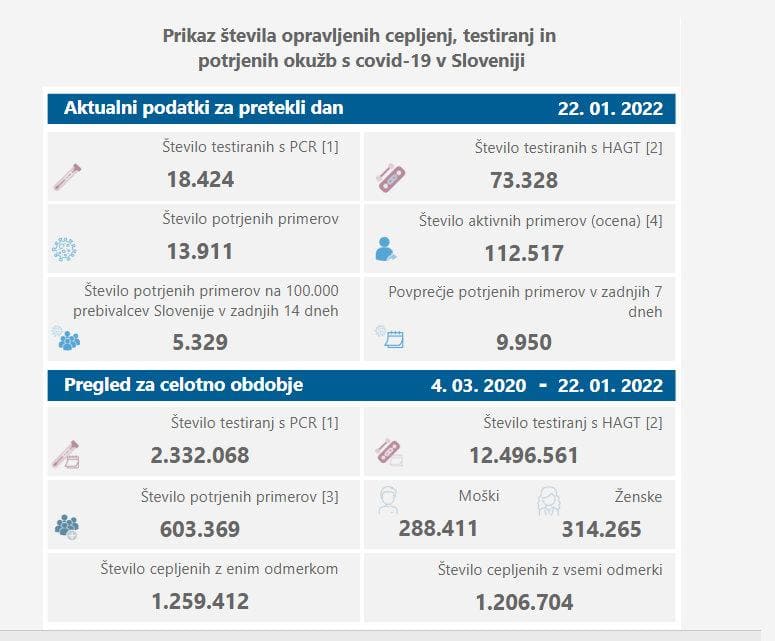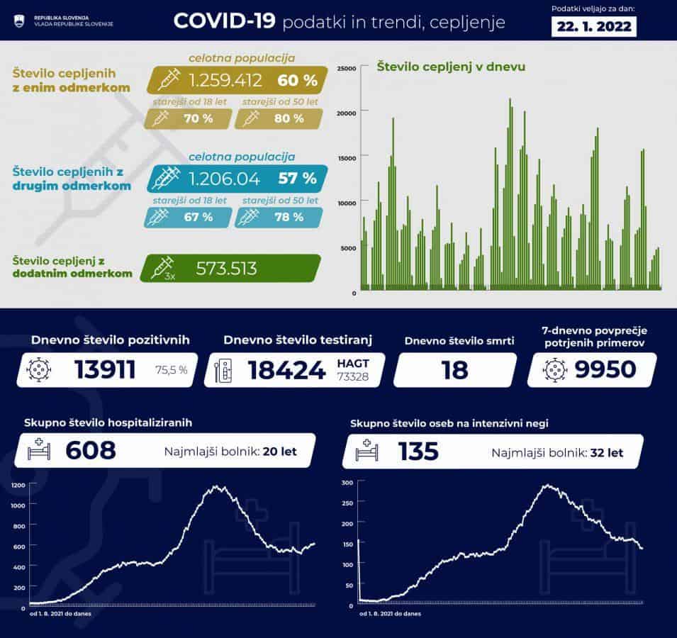 V soboto so v Sloveniji ob opravljenih 18.424 PCR-testih potrdili 13.911 okužb z novim koronavirusom, dan pred tem so ob opravljenih 14.650 PCR-testih potrdili 9945 okužb. Delež pozitivnih PCR-testov je v soboto znašal 75,5 odstotka, dan pred tem je bil 67,9–odstoten. Včeraj so opravili tudi 73.328 hitrih testov, katerih pozitivne rezultate preverjajo še s PCR-testi, dan pred tem 107.468.