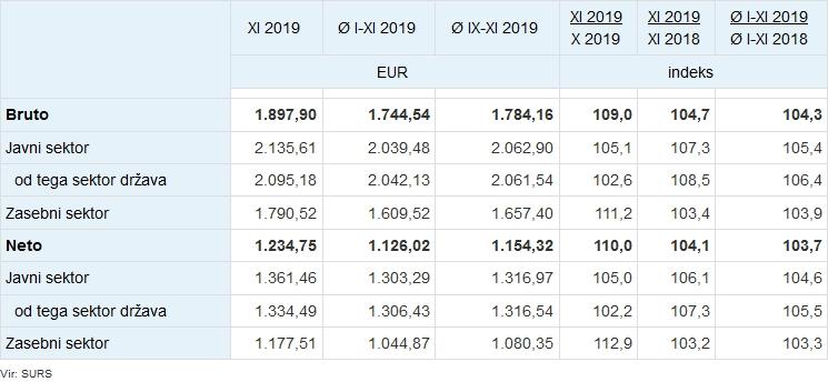 Povprečna bruto plača za november 2019 je znašala 1.897,90 EUR in je bila nominalno za 9,0 %, realno pa za 8,9 % višja od plače za oktober 2019. Tolikšna razlika v višini povprečne plače glede na prejšnji mesec je bila predvsem posledica višjih izrednih izplačil (13. plač in božičnic), izplačanih s plačo za november 2019.