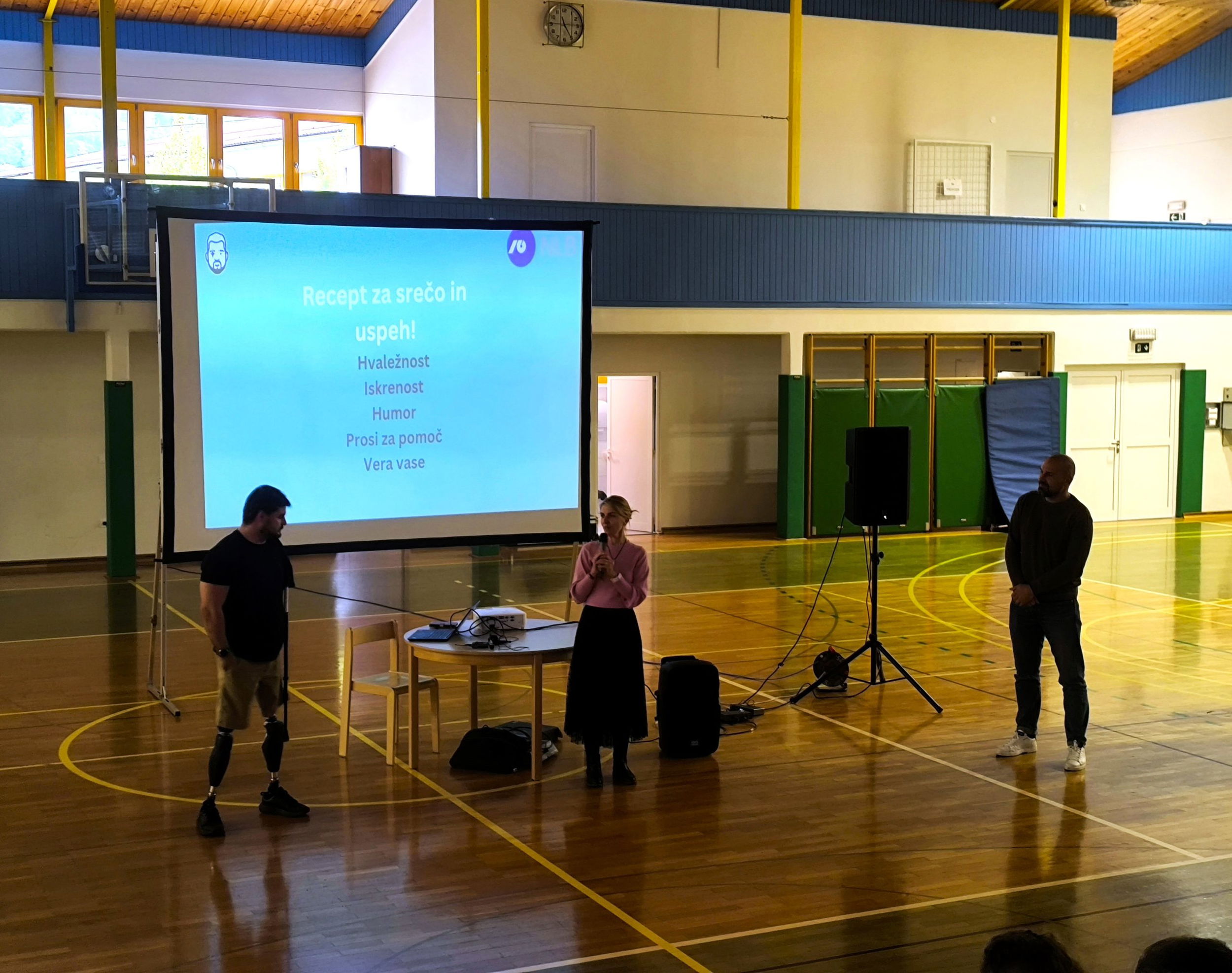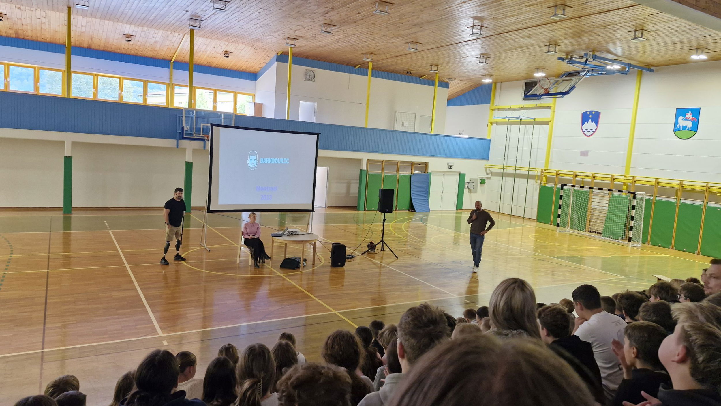 Učenkam in učencem je predstavil utrinke iz svojega življenja, težko otroštvo, športno kariero, sedanje življenje motivacijskega govorca ter načrte za prihodnost – z njimi je delil tudi, da je začel snemat svoj podcast.