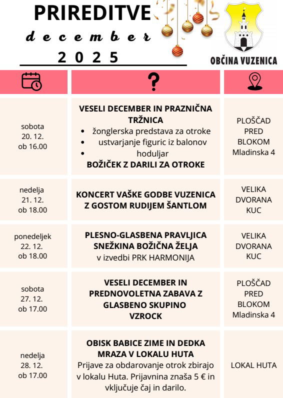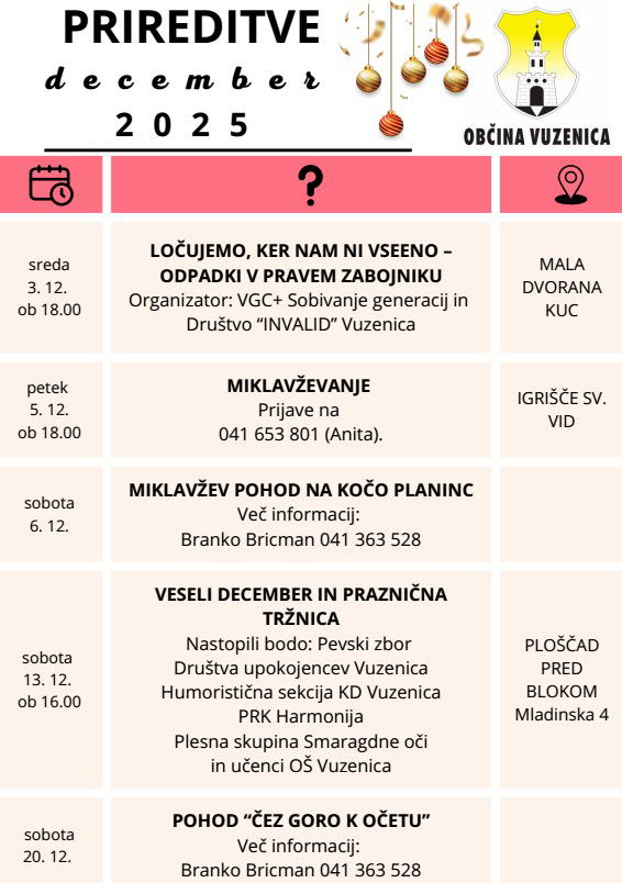 S pestrimi dogodki bodo pričeli že v sredo, 3. decembra 2025, ko bodo pripravili delavnico ”Ločujemo, ker nam ni vseeno  – odpadki v pravem zabojniku”. Že dva dni kasneje, v petek, 5. decembra, bo Vuzenico obiskal prvi od dobrih mož in otroke razveselil na Miklavževanju.