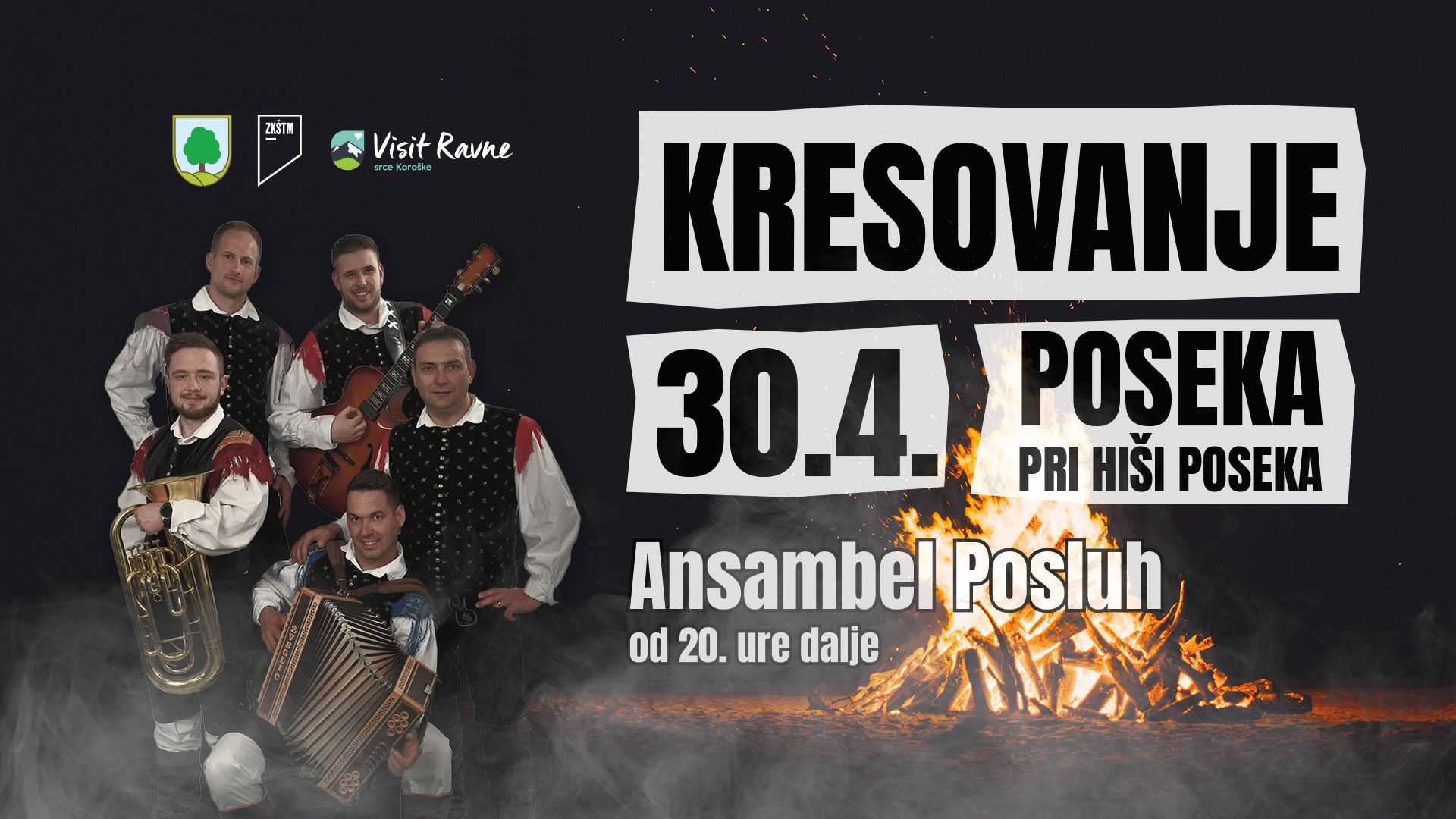 Ekipa ZKŠTM Ravne vas v četrtek, 30. aprila 2026, vabi na kresovanje na Poseko, kjer boste skupaj prižgali tradicionalni kres. Ob Hiši Poseka bodo za odlično vzdušje ob dobri glasbi od 20. ure skrbeli člani Ansambla Posluh.