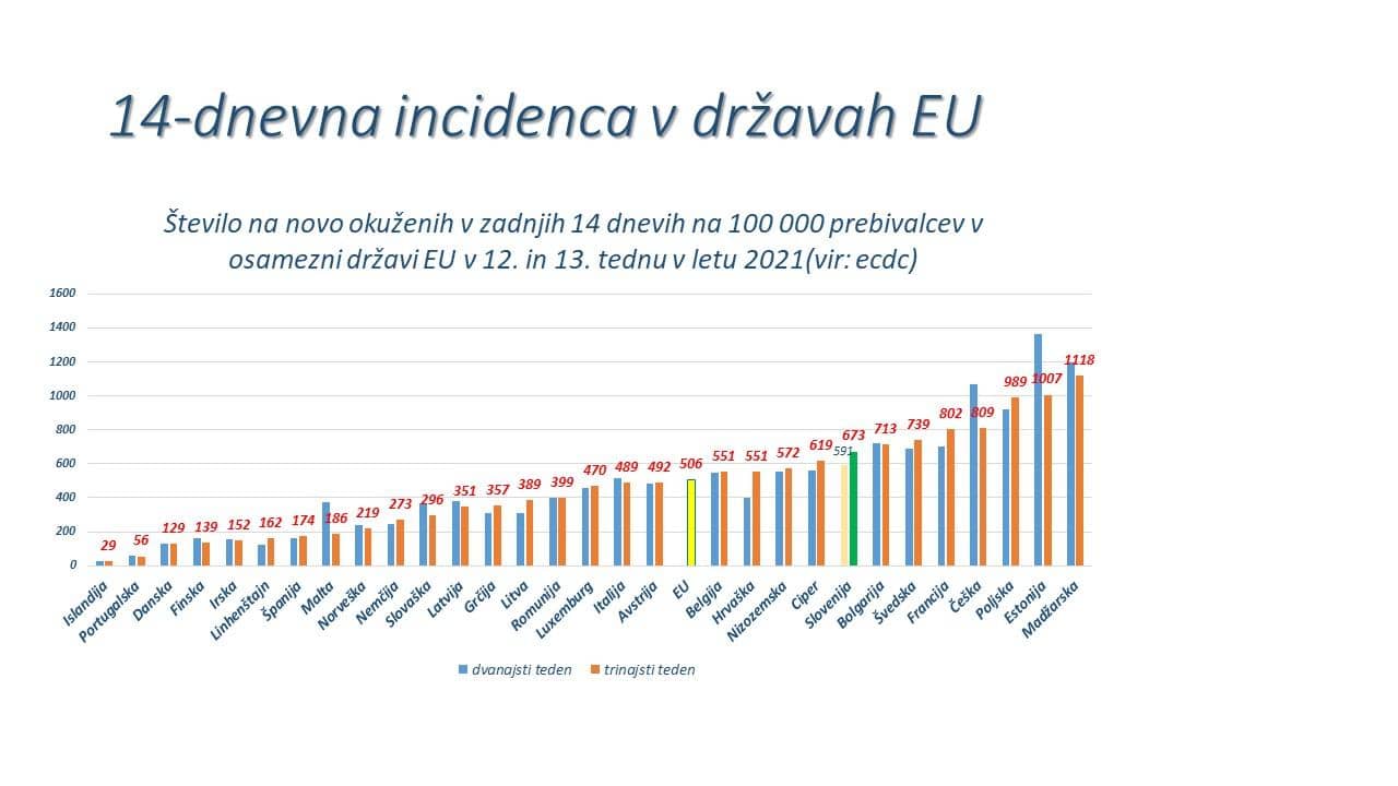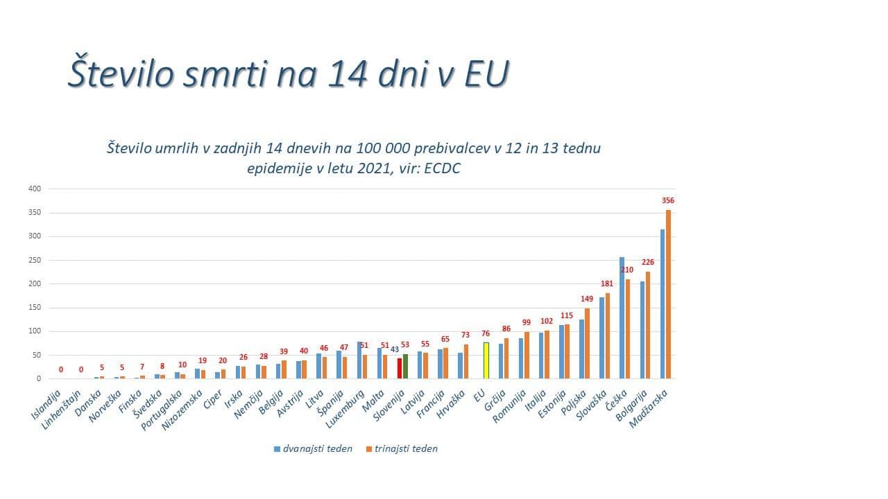 "14-dnevna incidenca na 100.000 prebivalcev v Evropi znaša 506, Slovenija je malo nad evropskim povprečjem. V zadnjih tednih smo se povzpeli višje, kar pomeni, da smo v fazi rasti okužb. Narediti moramo vse, da zadržimo epidemijo na čim nižjem nivoju," je dejal Krek. Po številu smrti v zadnjih 14 dnevih na 100.000 prebivalcev pa je Slovenija malo boljša od evropskega povprečja, "kar je zelo pohvalno. Želimo si, da se smrtnost v prihodnje ne bi več povečala," je dodal.