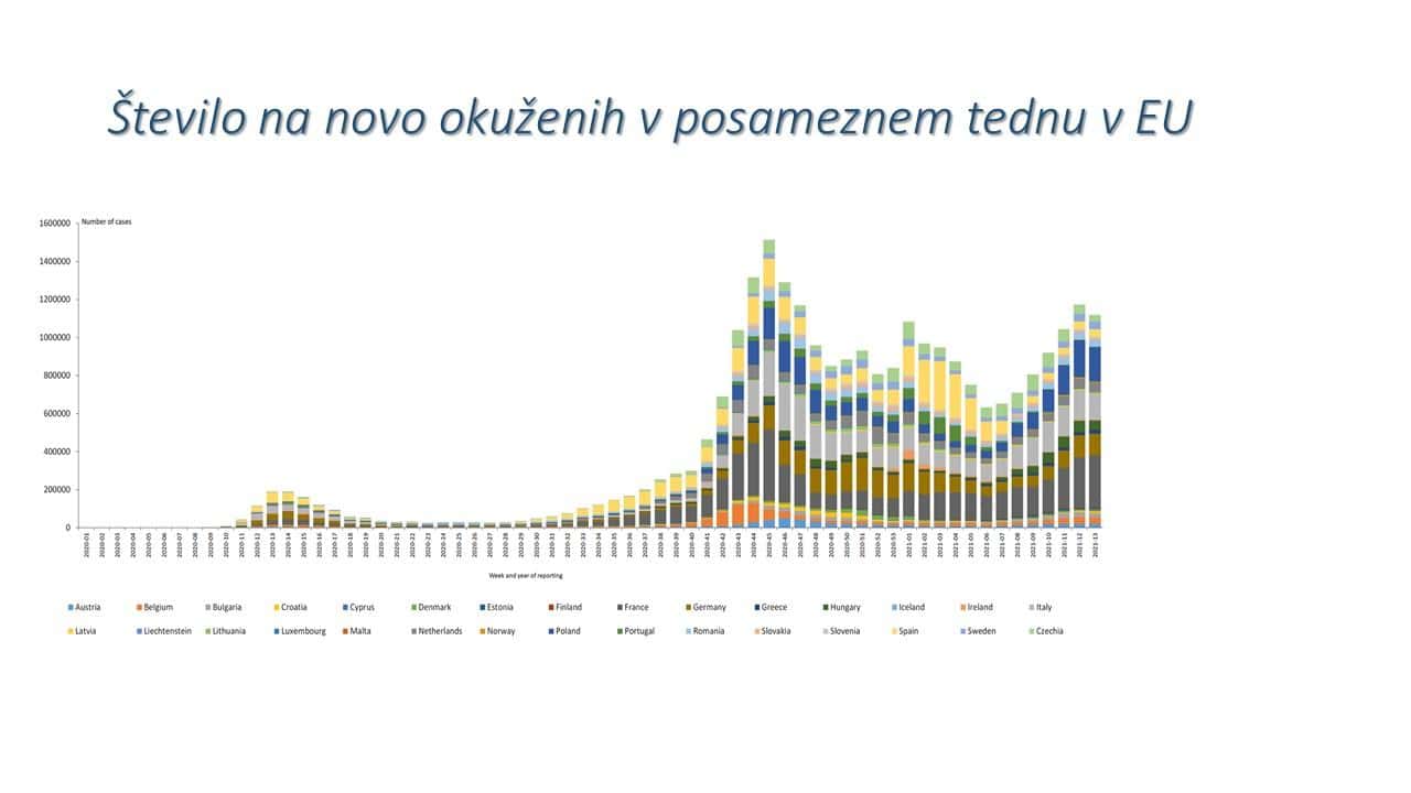 "V Evropi smo trenutno priča epidemičnemu valu, ki traja že nekaj tednov. Iz grafa lahko razberemo, da je še vedno zelo visoko število okuženih v Evropskem prostoru, zato ponovno opozarjam, da se striktno držimo vseh preventivnih ukrepov," je poudaril Krek. Največjo grožnjo po besedah Kreka trenutno pomeni angleška različica virusa, ki je bistveno bolj kužna in predstavlja že polovico vseh okužb v državi, v nekaterih regijah je dosegla tudi že 85 odstotkov. "Britanski sev se hitreje širi. Pričakujemo, da bomo imeli čez nekaj tednov večino okuženih z britanskim sevom, je omenil Krek in dodal, da so zaradi novih sevov, ki se hitro širijo, nujni preventivni ukrepi", je poudaril.