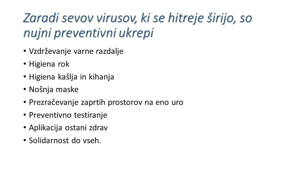 Cepljenje je tisto, ki bo najhitreje omogočilo ravnovesje življenja z virusom. Zato je vse, ki imajo možnost, da se cepijo, pozvala, da se cepljenja udeležijo in tudi na ta način vplivajo na potek epidemije.