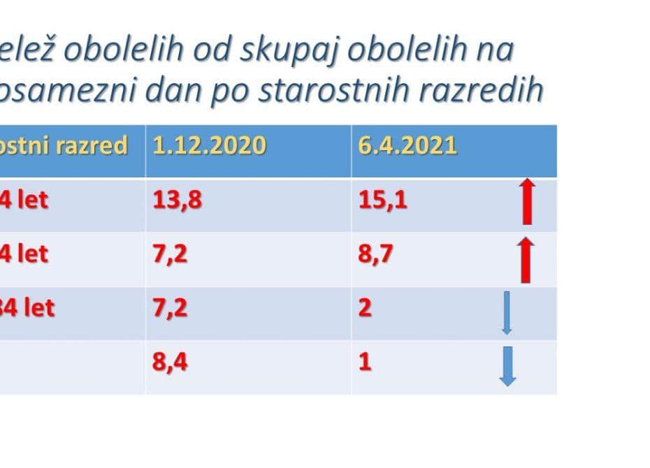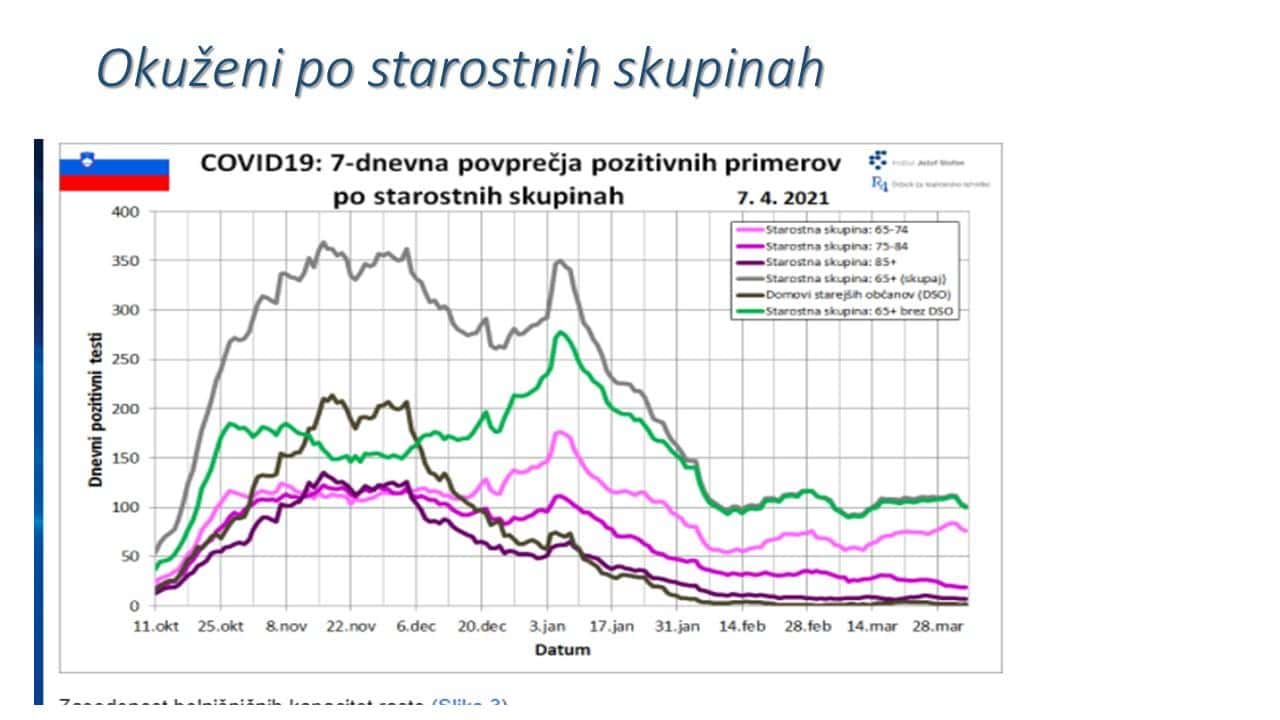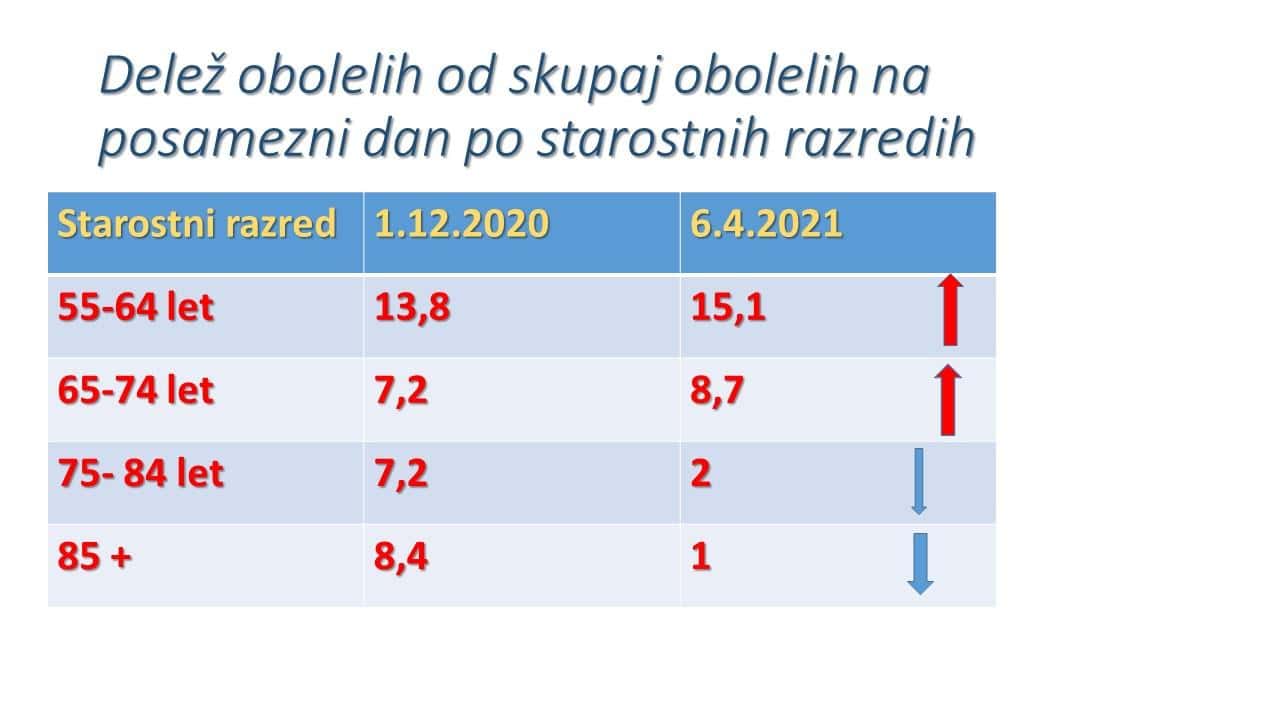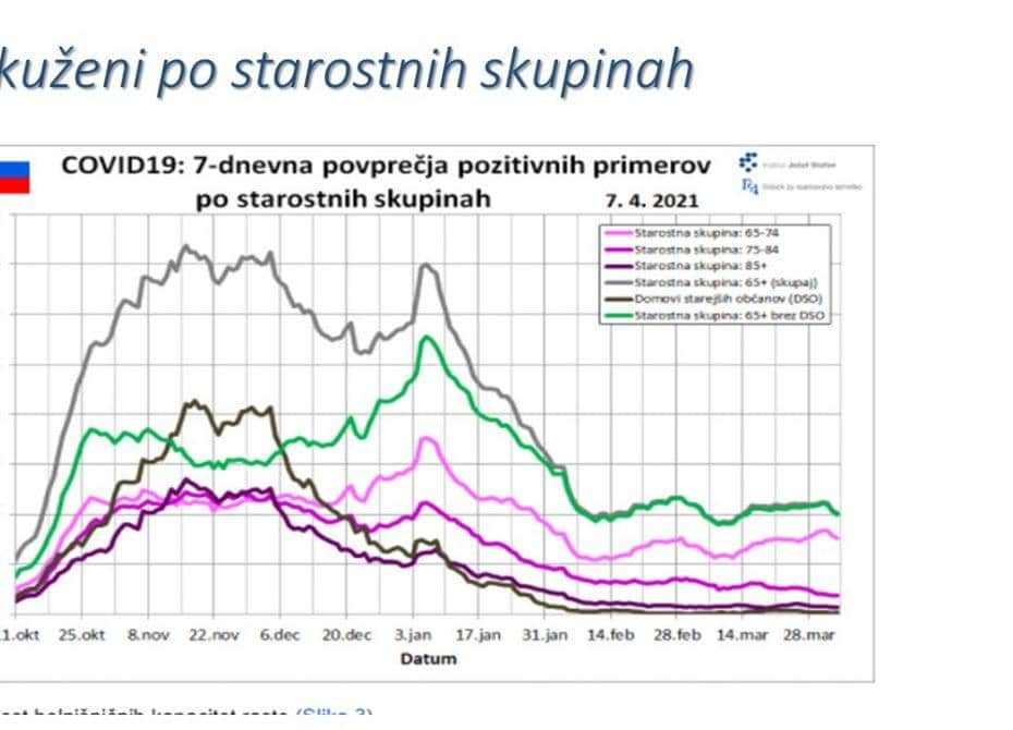 Največ okužb je trenutno v delovno aktivnem delu prebivalstva. "Spodnji graf je prikaz uspešnega cepljenja. V starostni skupini 80+ praktično nimamo več obolelih. Starostna skupina 60-70 je še vedno ogrožena, ker je še nismo dokončno pocepili. Naš cilj je, da do konca meseca pocepimo vse starejše od 60 let," je navedel Krek.