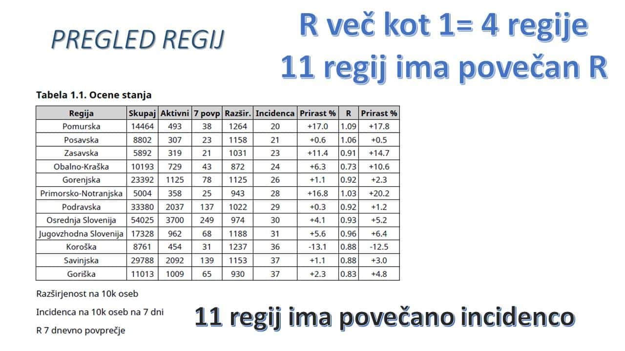 R je večji od 1 v štirih regijah, v 11 regijah pa je povečan, hkrati pa je povečana tudi incidenca v 11 regijah, kar pomeni, da gre za razvoj epidemije ter da se bližamo rdeči in črni fazi. "Danes imamo tri regije rdeče, kar nekaj pa jih je tik pred rdečo fazo. Predpostavljamo, da bomo imeli v torek Slovenijo popolnoma rdečo, nekaj regij pa zna priti celo v črno fazo," je še enkrat poudaril Krek.