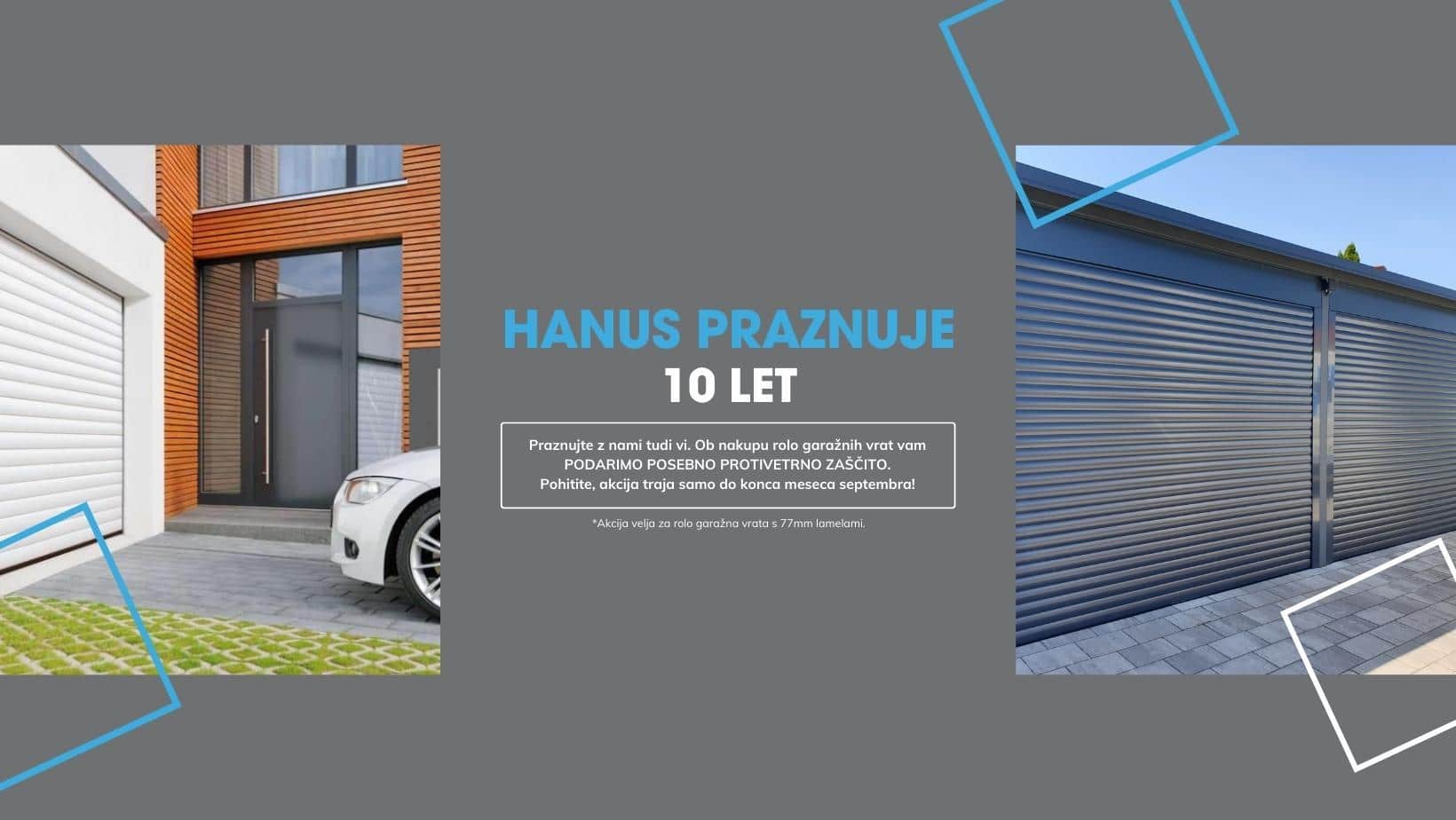 Ob 10. obletnici podjetja Hanus, vam v mesecu septembru ob nakupu rolo garažnih vrat podarjajo protivetrna vodila. Razvili so namreč nov sistem vodil, ki vetrni razred vrat povečajo kar za dva razreda. Akcija velja samo ob nakupu garažnih vrat s 77 mm lamelami.
