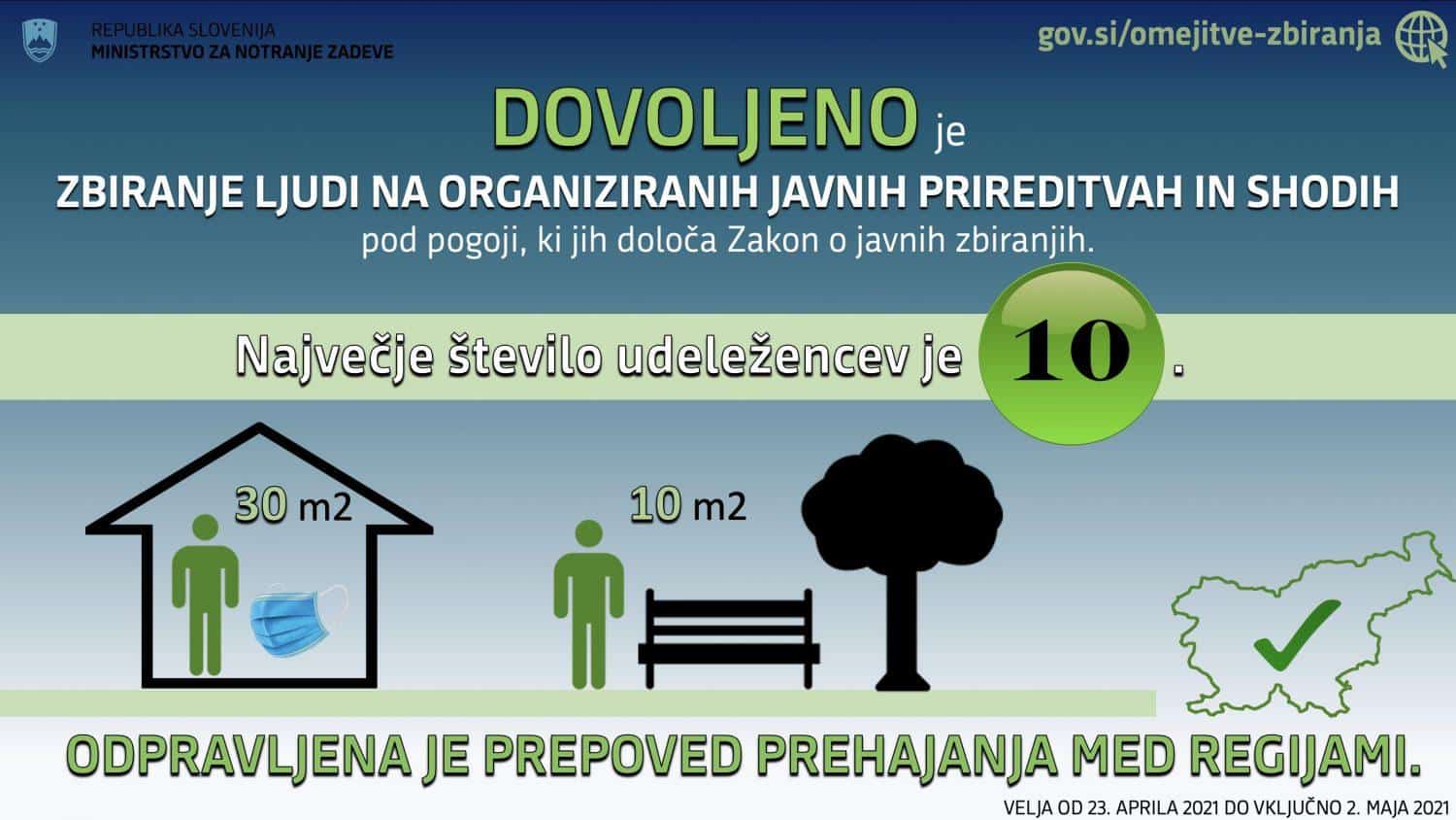 Ob omejitvi števila udeležencev shodov in prireditev na do deset ljudi je število oseb v zaprtih prostorih omejeno na enega udeleženca na 30 kvadratnih metrov, na prostem pa na enega udeleženca na deset kvadratnih metrov. Medosebna razdalja med udeleženci mora biti najmanj 1,5 metra, razen med osebami iz skupnega gospodinjstva. V zaprtih prostorih je obvezna uporaba zaščitnih mask.